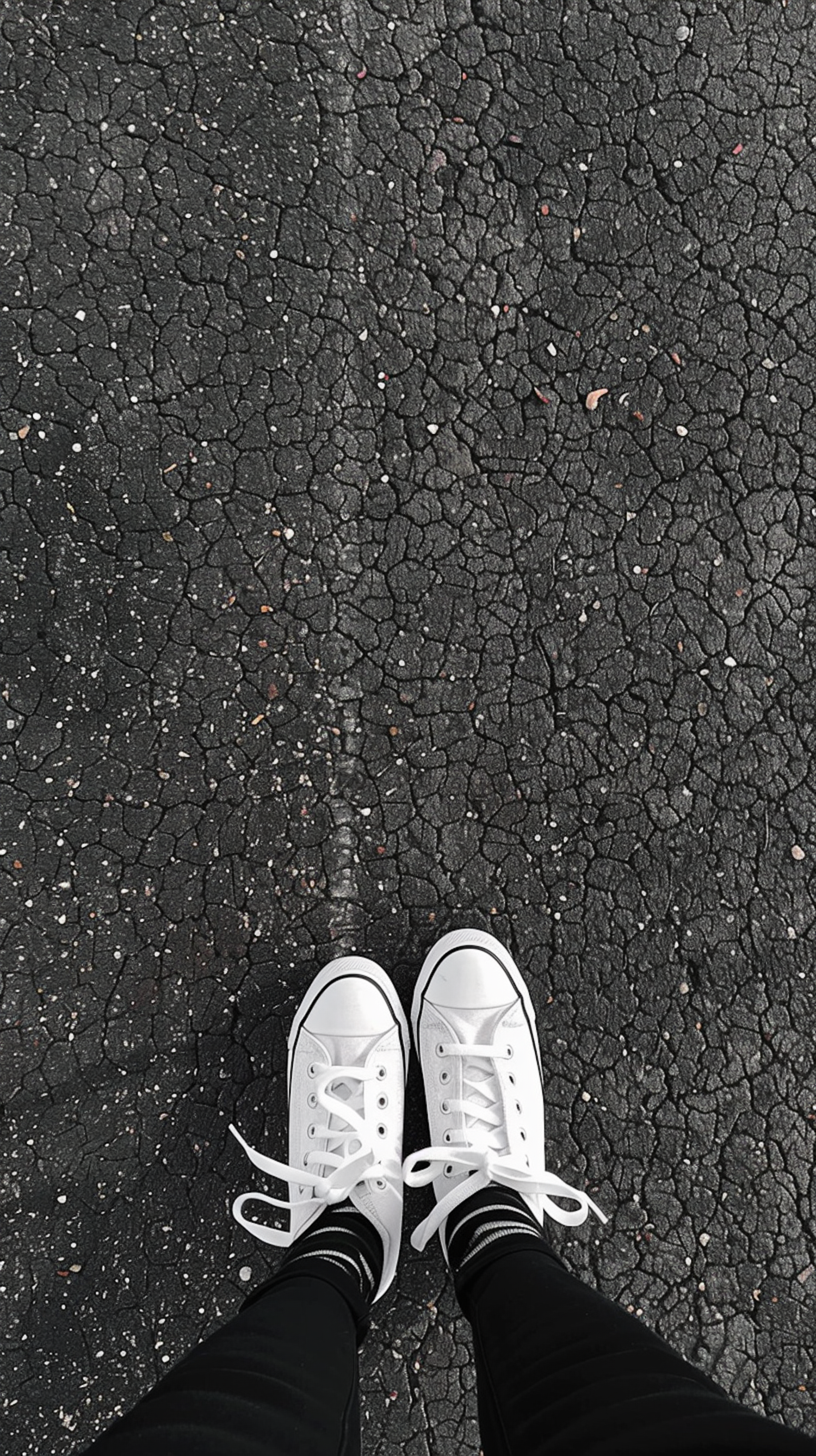 White sneakers on cracked asphalt, black pants, striped socks. Clean shoes contrast with textured ground.