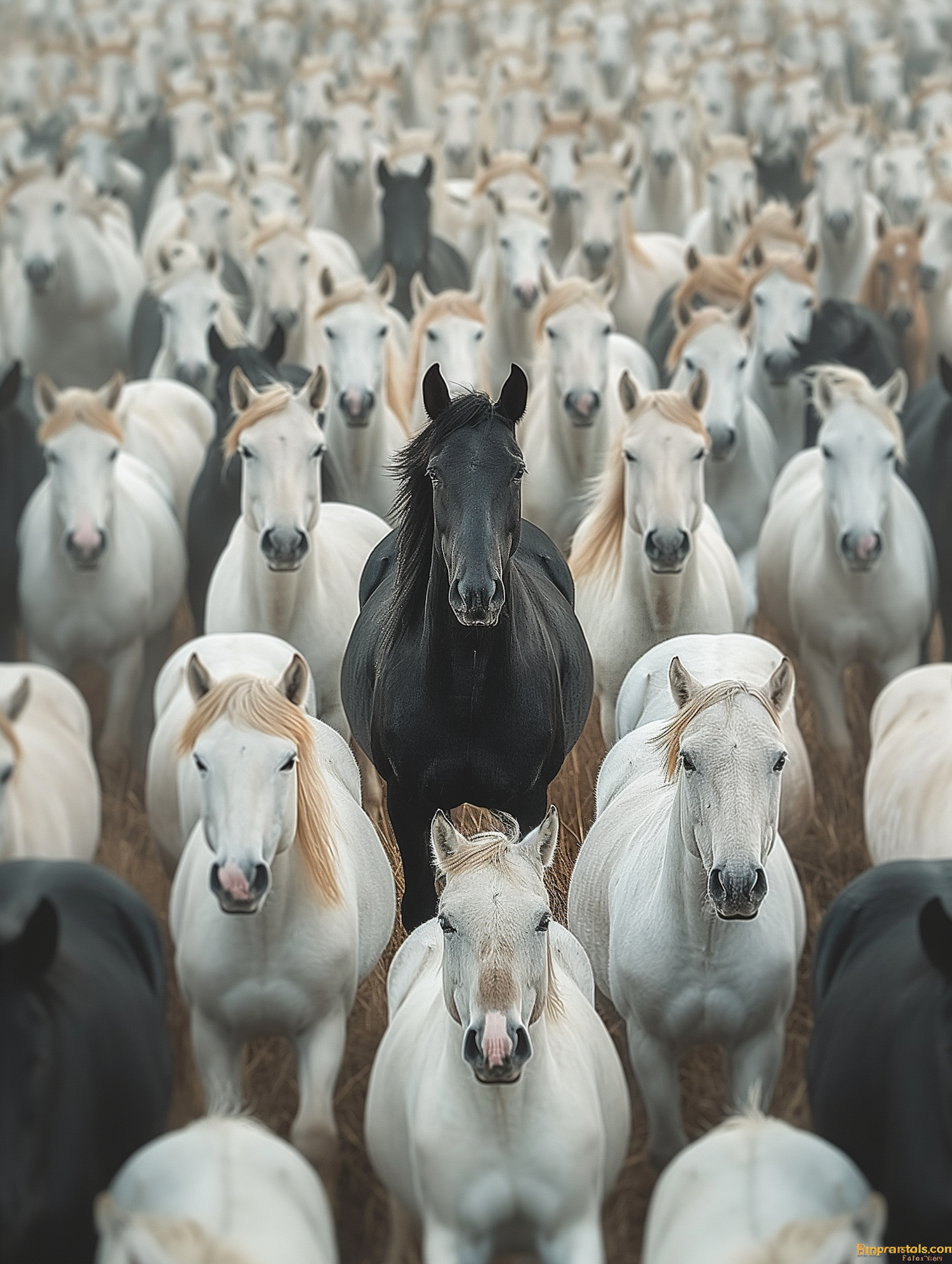 A striking image of a herd of white horses with a single black horse in the center, creating a captivating contrast.