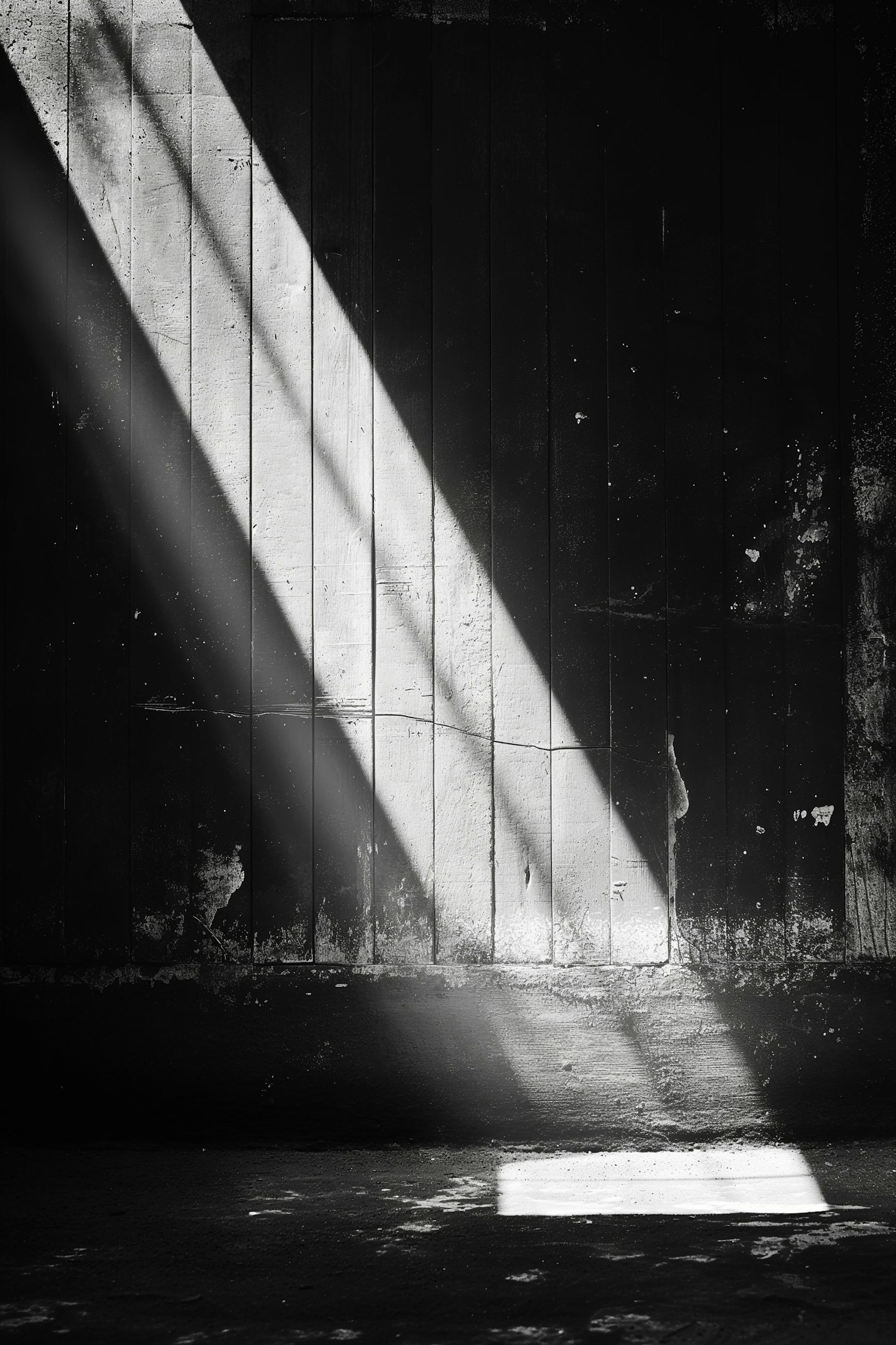 Black and white photo of sunlight streaming through a window, casting dramatic shadows on a textured wall.