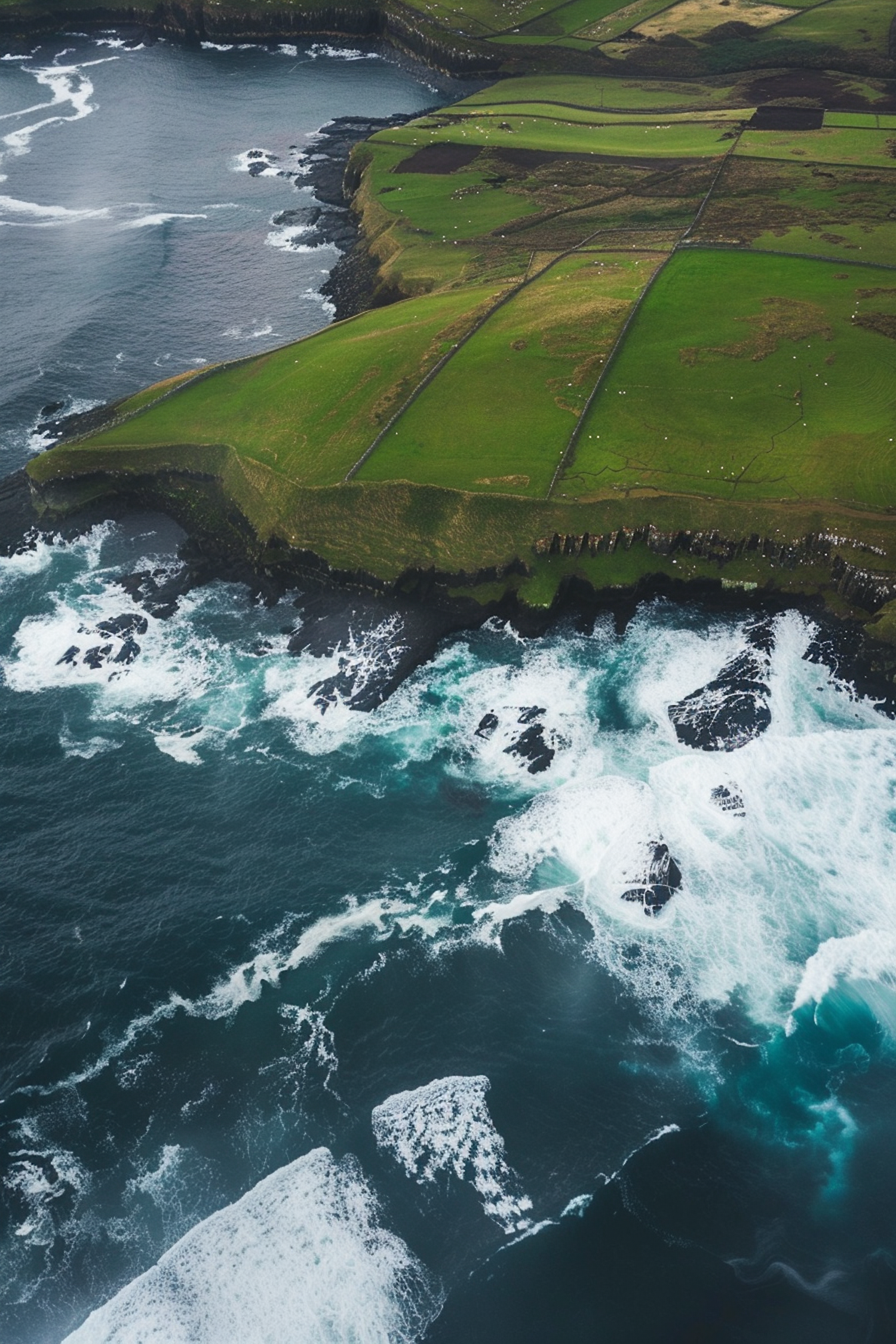 Aerial view of lush green fields meeting a rugged coastline with crashing waves and stone walls, creating a stunning natural contrast.