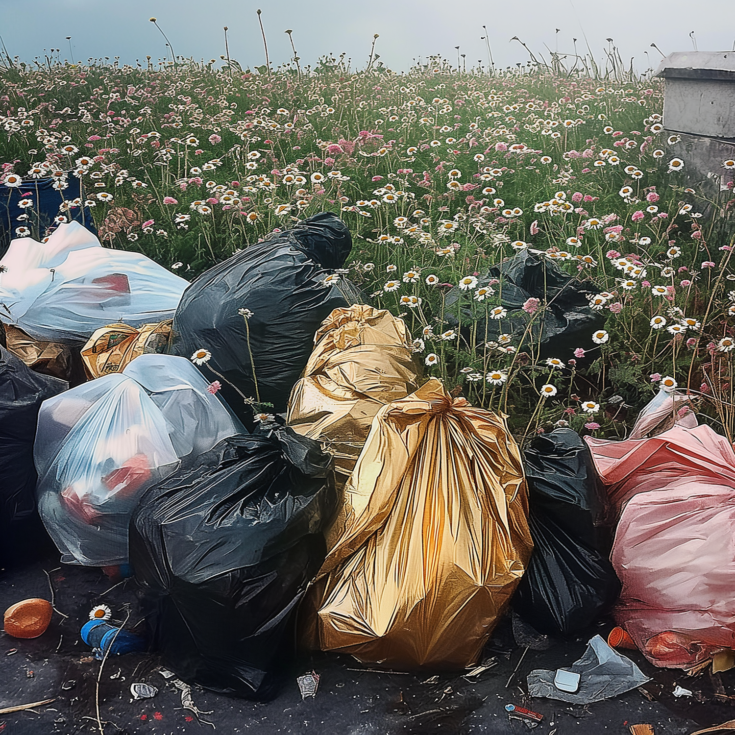 Colorful garbage bags amidst a field of wildflowers, contrasting human waste with natural beauty.