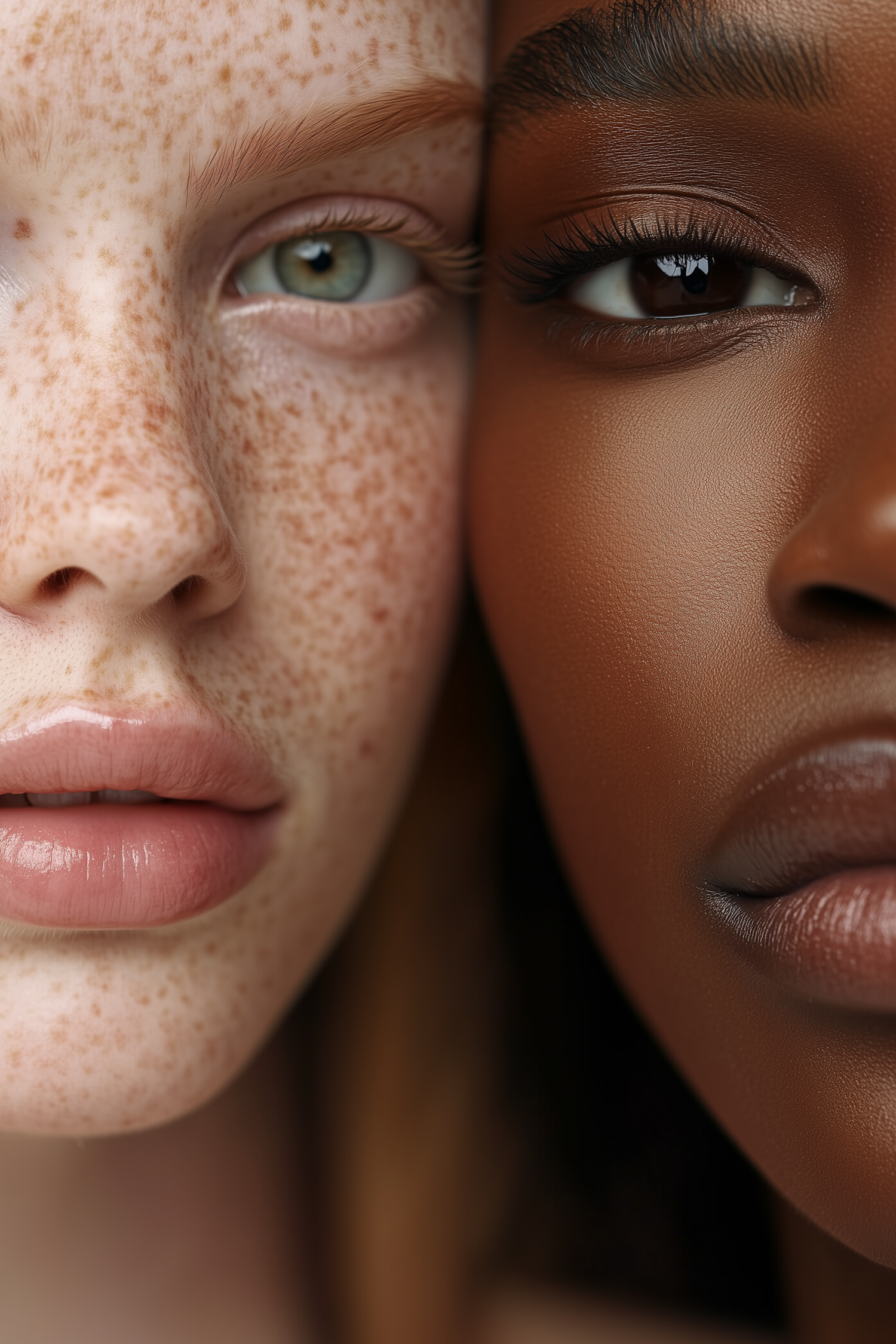 Close-up of two women with contrasting skin tones, showcasing freckles, smooth skin, and natural beauty in an intimate composition.