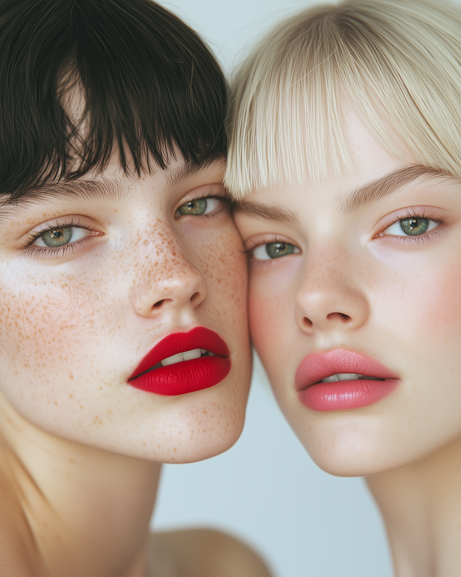 Two women with contrasting hair colors and bold makeup pose closely, highlighting their freckles, green eyes, and vibrant lipstick shades.