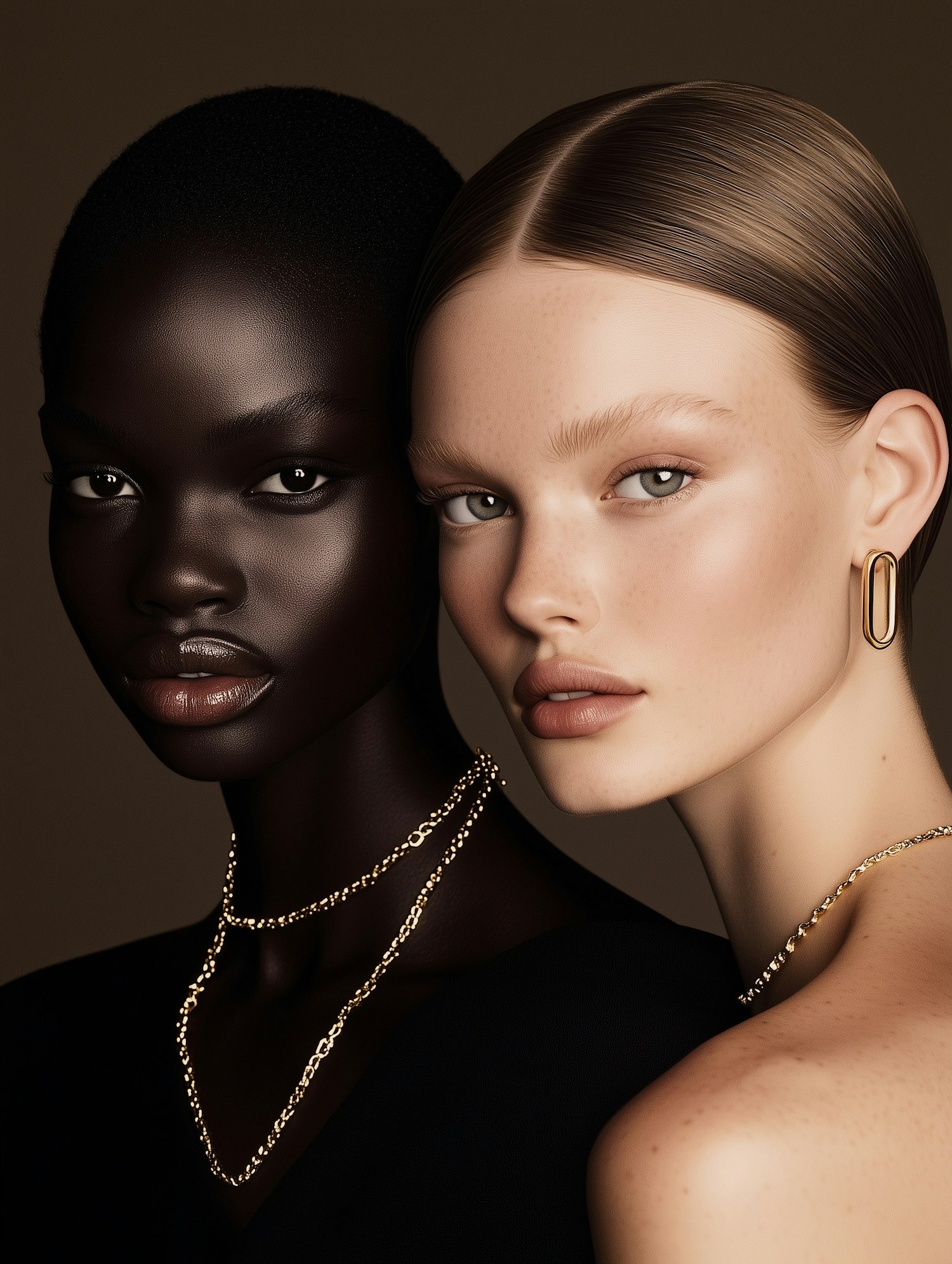 Two women with contrasting skin tones and elegant gold jewelry pose gracefully against a muted brown background.