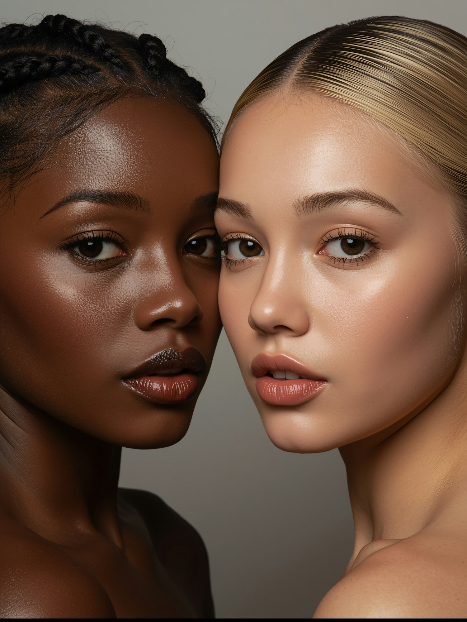 Two women with contrasting skin tones and glowing complexions pose closely, highlighting their natural beauty and unique features.