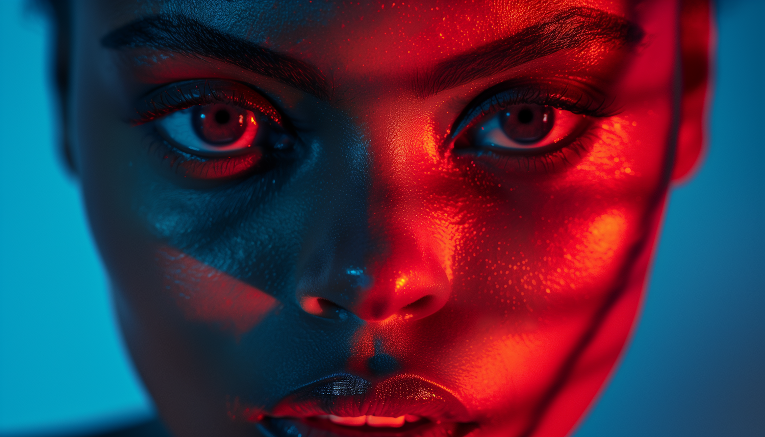 Close-up of a face with dramatic red and blue lighting, emphasizing texture and a surreal, futuristic gaze.