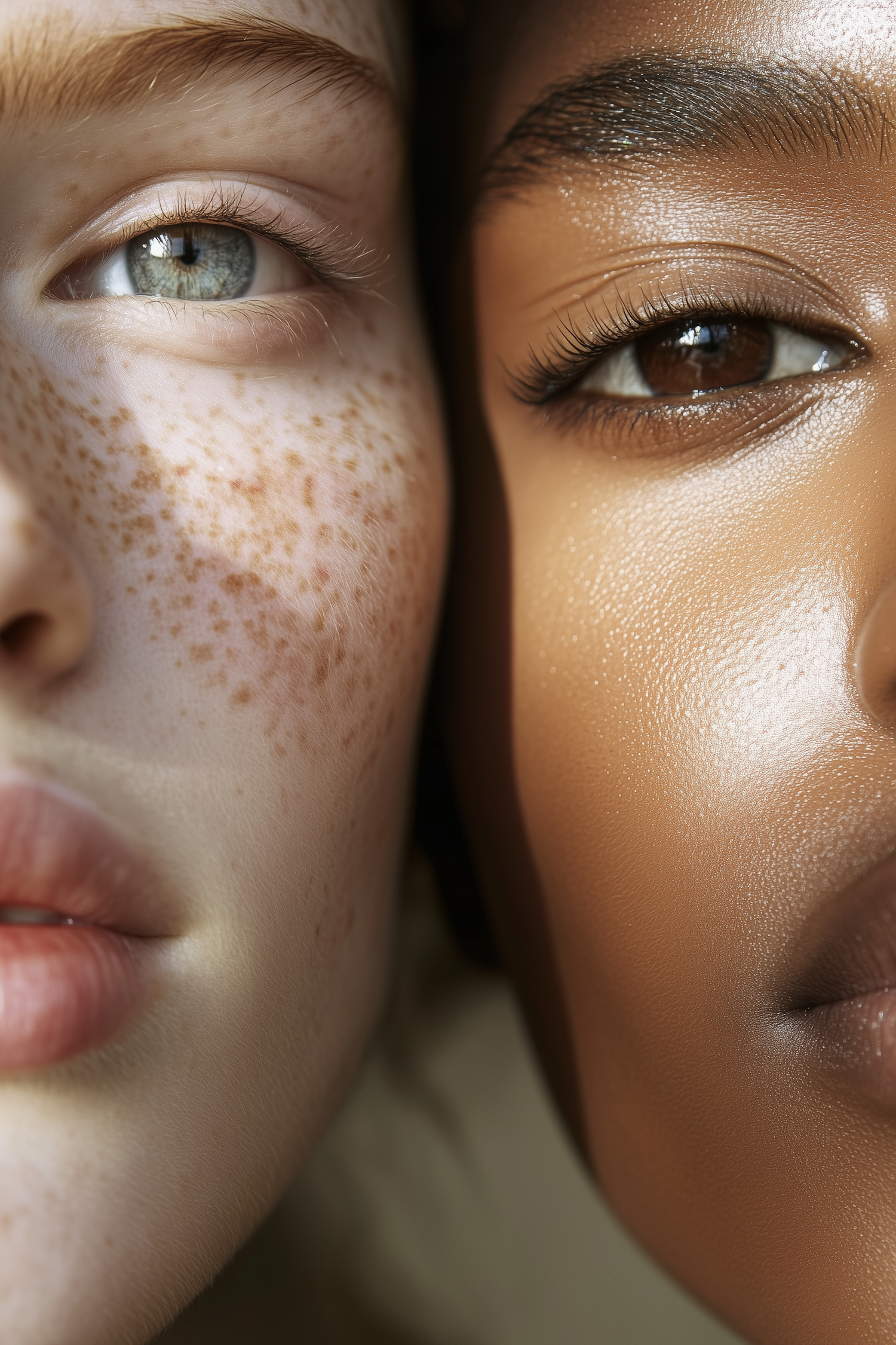 Close-up of two faces with contrasting skin tones, freckles, and radiant textures, showcasing natural beauty and diversity.