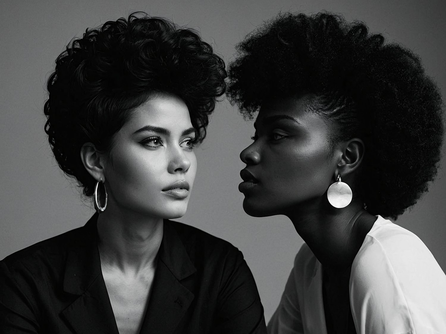 Black and white portrait of two women with contrasting hairstyles and expressions, highlighting elegance and diversity.