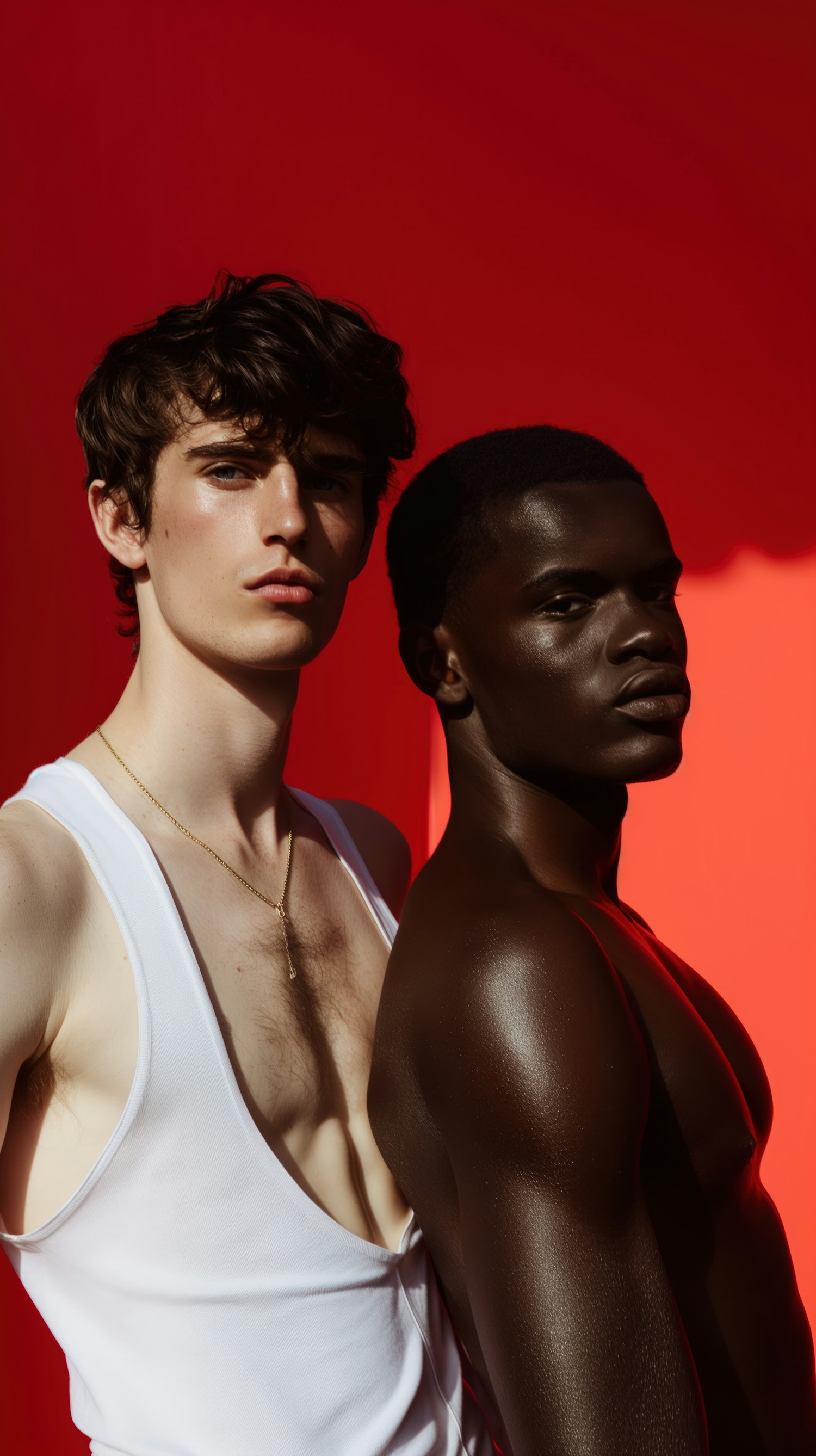 Two men stand against a vibrant red background, one in a white tank top, the other shirtless, creating a striking visual contrast.
