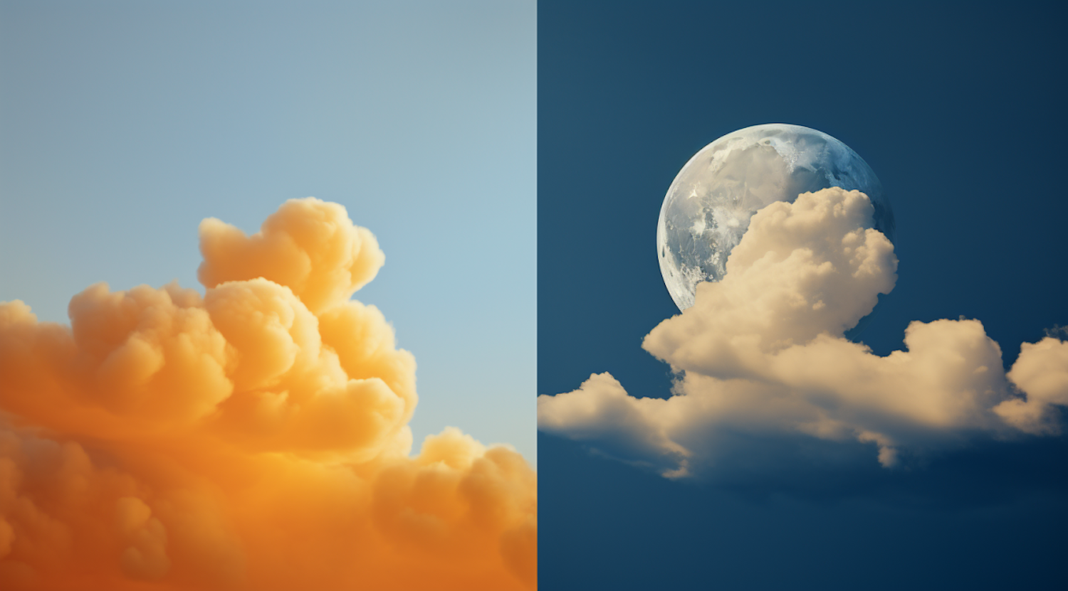 Split image of orange clouds at sunset and a moonlit night sky with clouds, showcasing vibrant and calming contrasts.