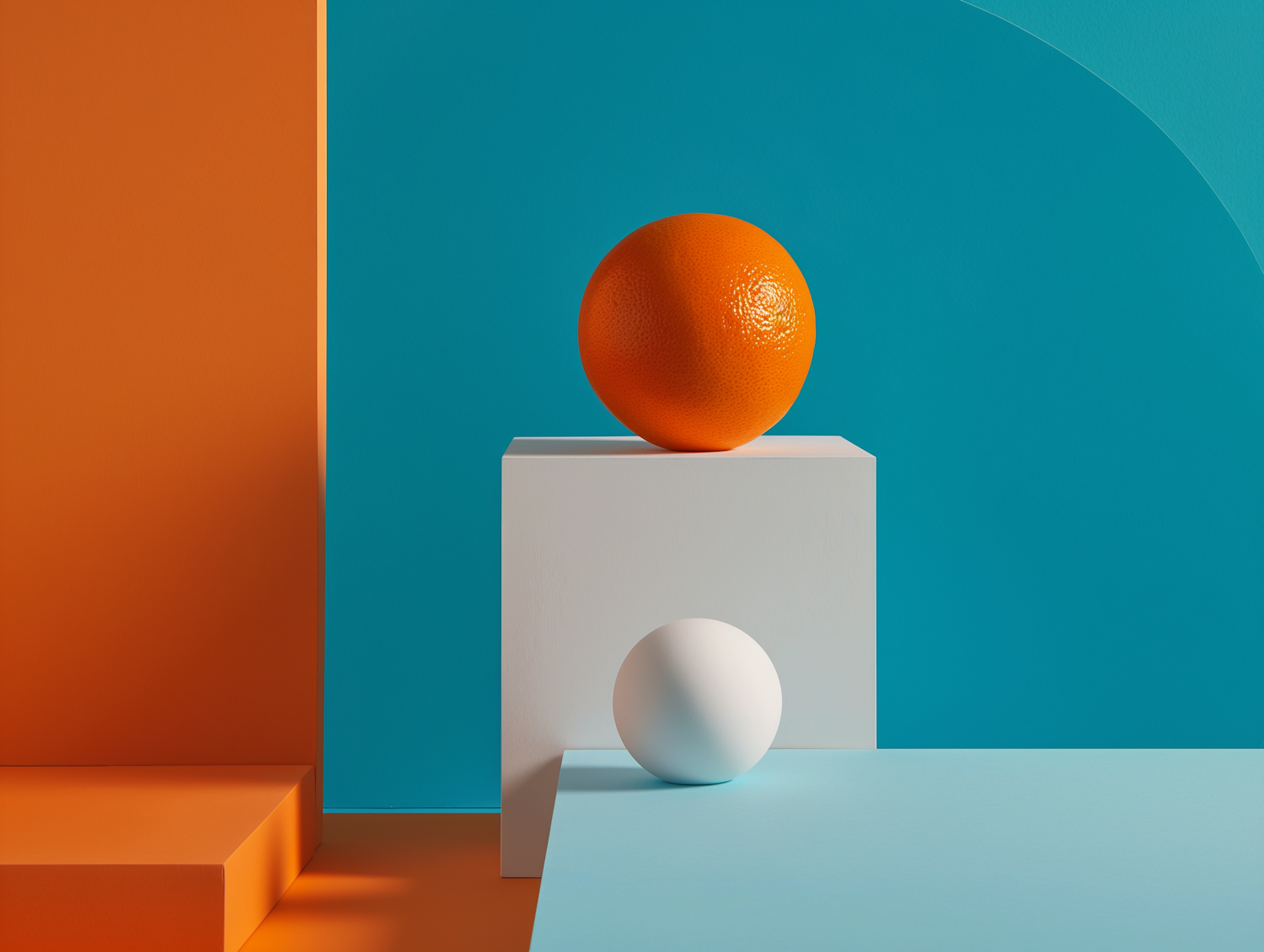 Minimalist geometric art with orange and white spheres on teal and orange backgrounds.
