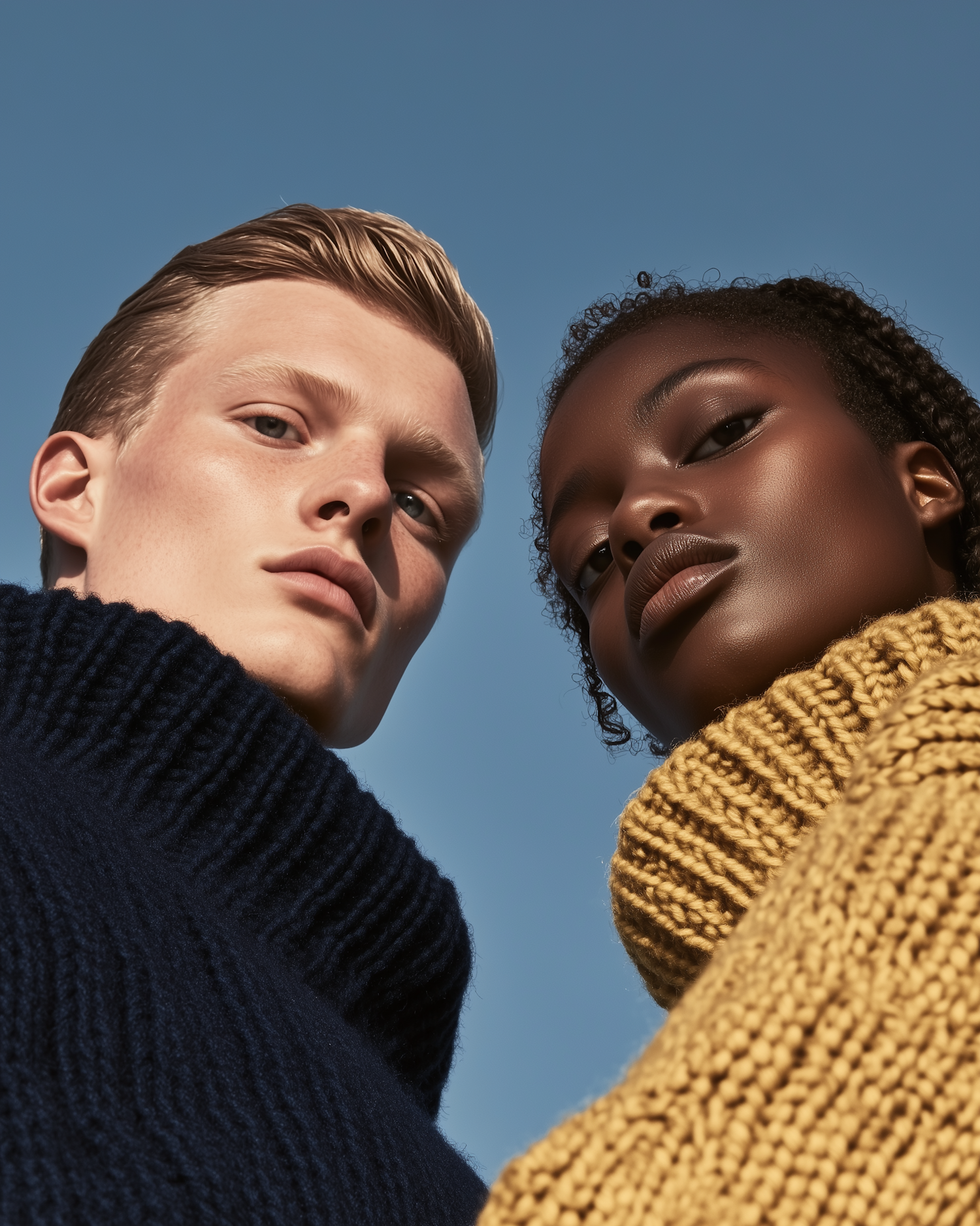 Close-up of two individuals in bold knitwear, set against a clear blue sky. Striking contrast of navy and mustard tones with direct gazes.