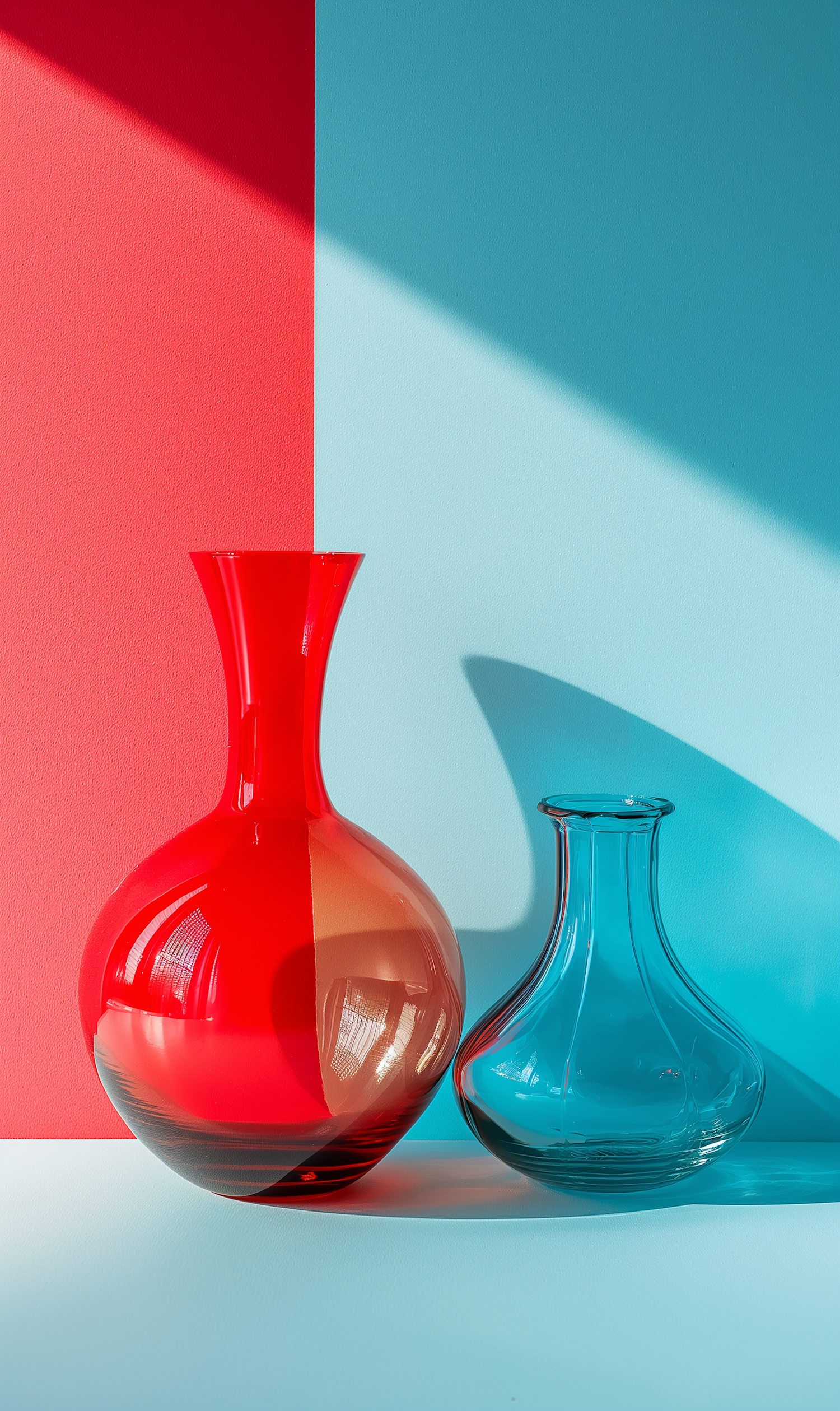 Two colorful glass vases on a vibrant red and blue background, showcasing bold contrasts and dynamic lighting effects.