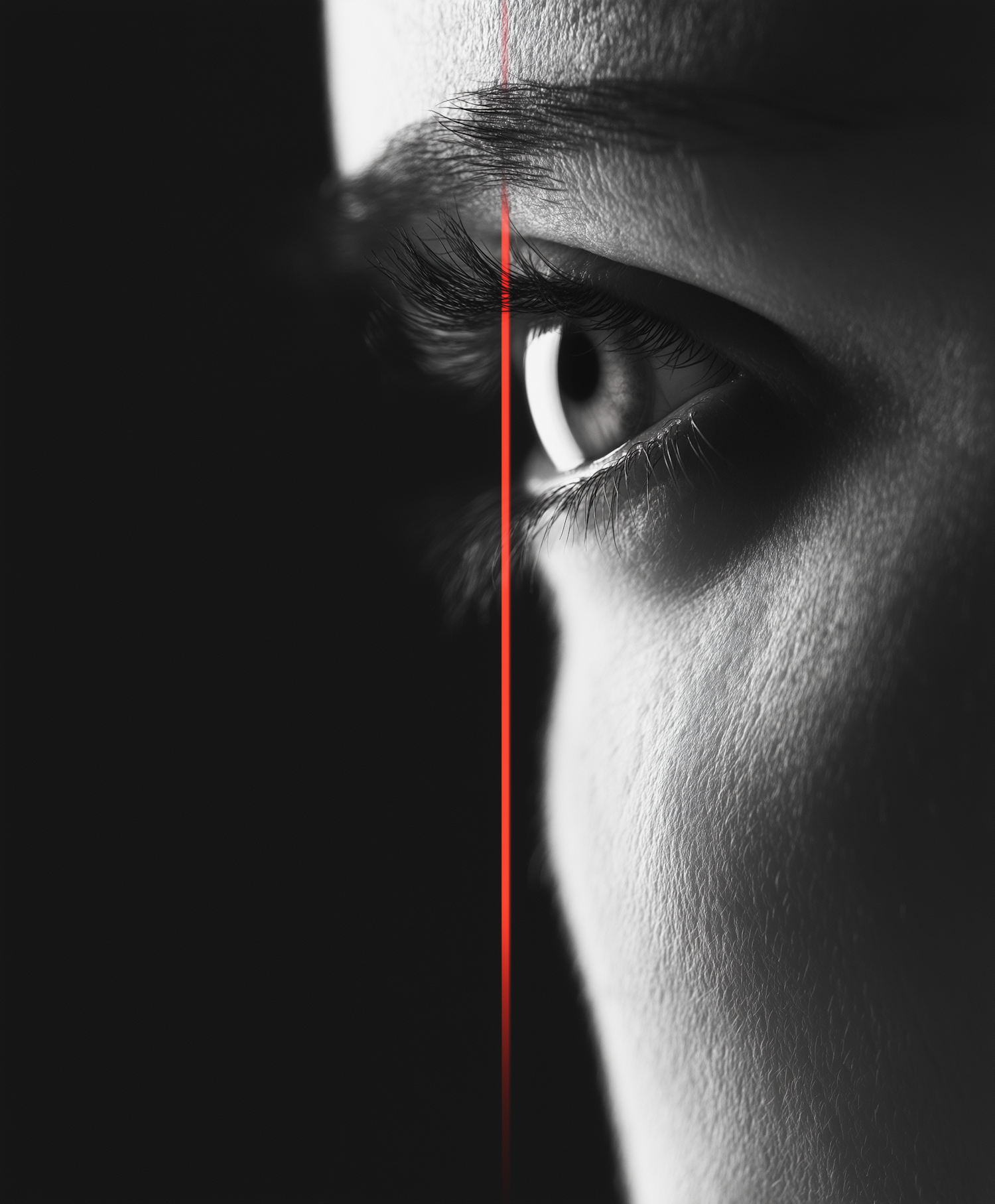 Close-up of a human eye with a red laser line intersecting it, creating a striking contrast against a dark background.