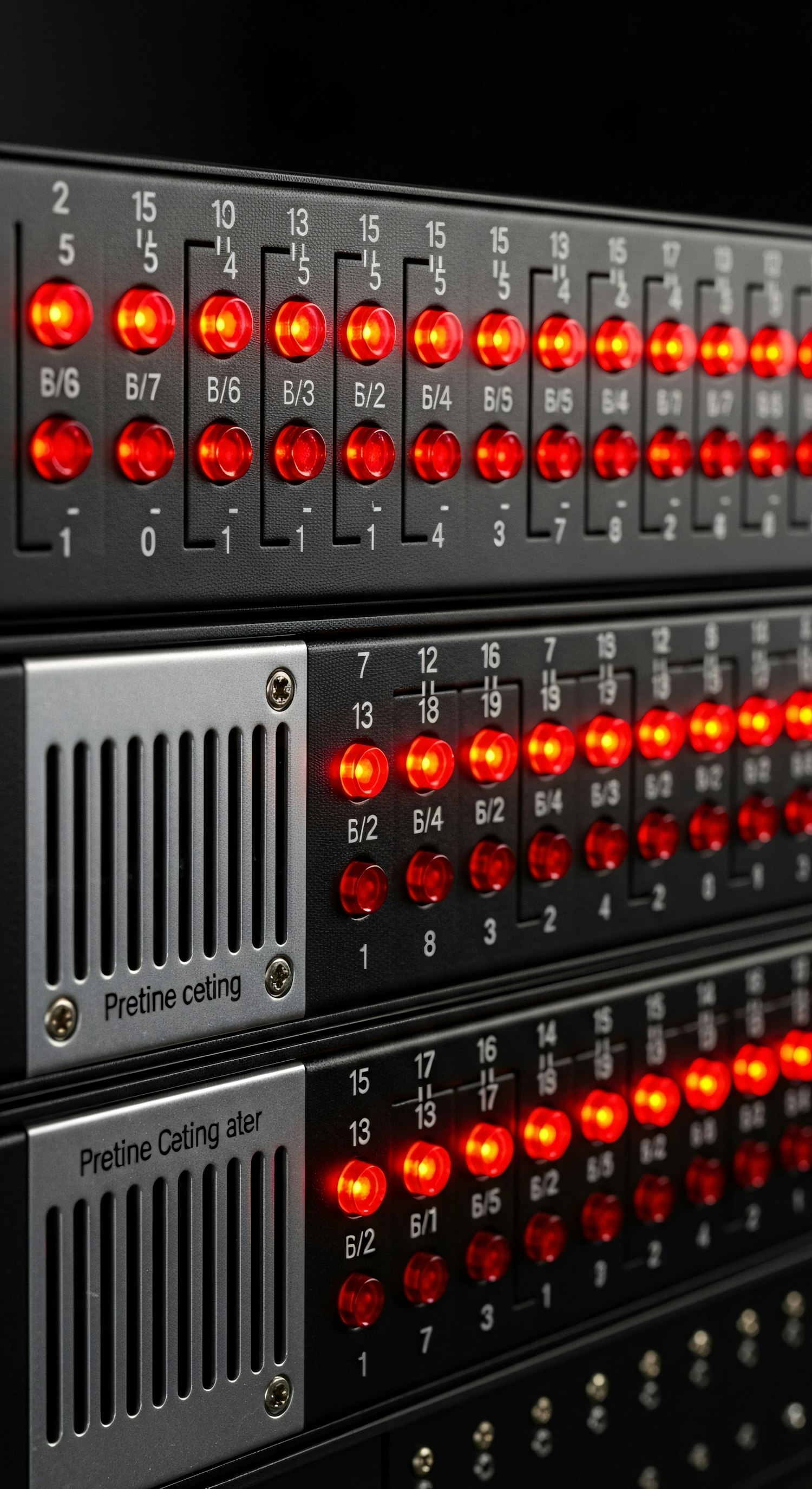 Close-up of a control panel with illuminated red LEDs and labeled switches, showcasing a technical and industrial design.