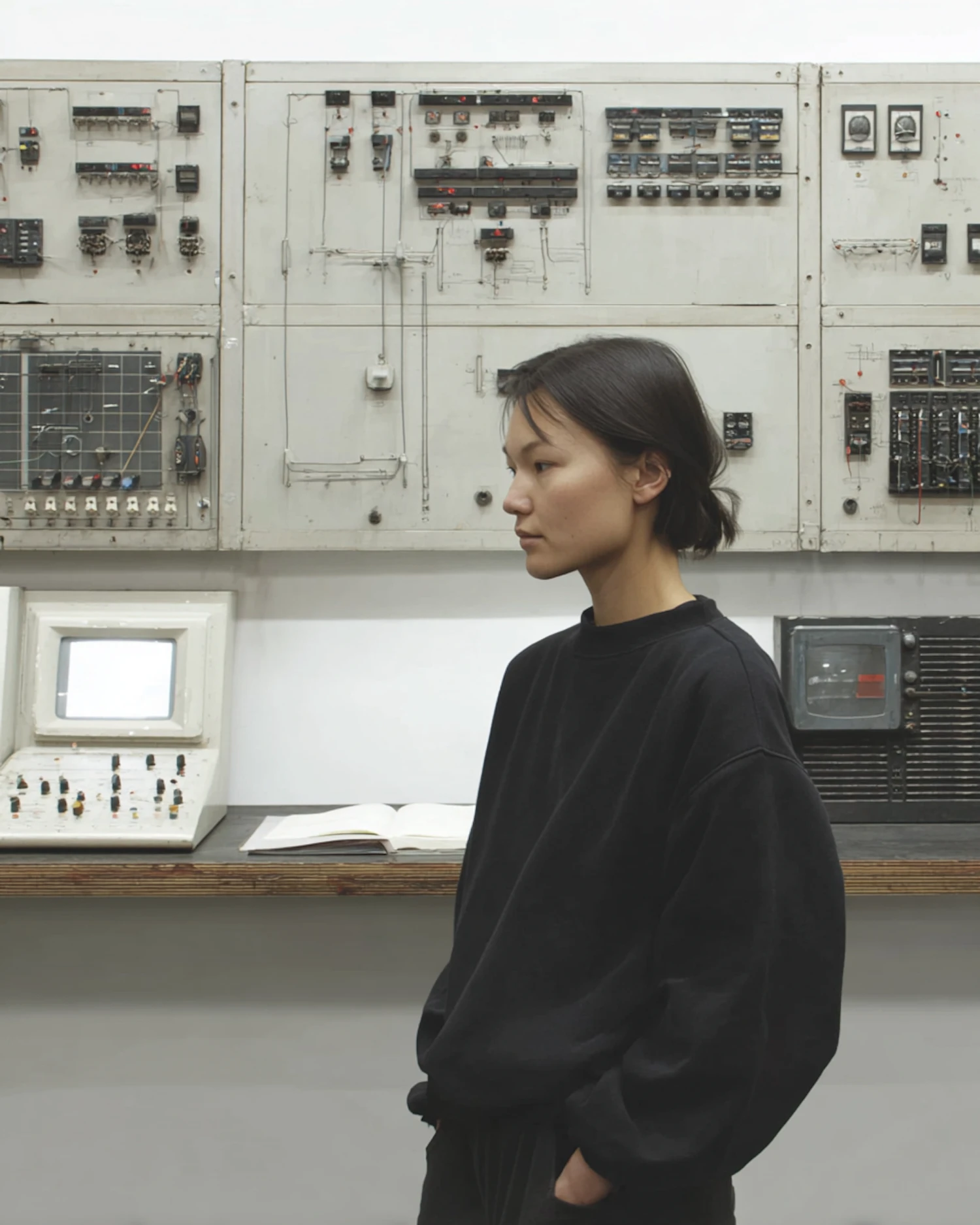 A person in a black sweater stands by vintage control panels and electronics, evoking a retro-tech aesthetic.