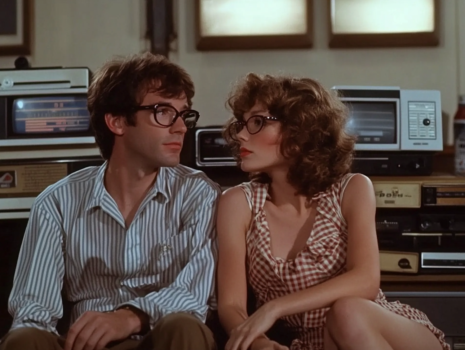 A retro-styled couple in glasses sits close, surrounded by vintage electronics, evoking a nostalgic 80s vibe.