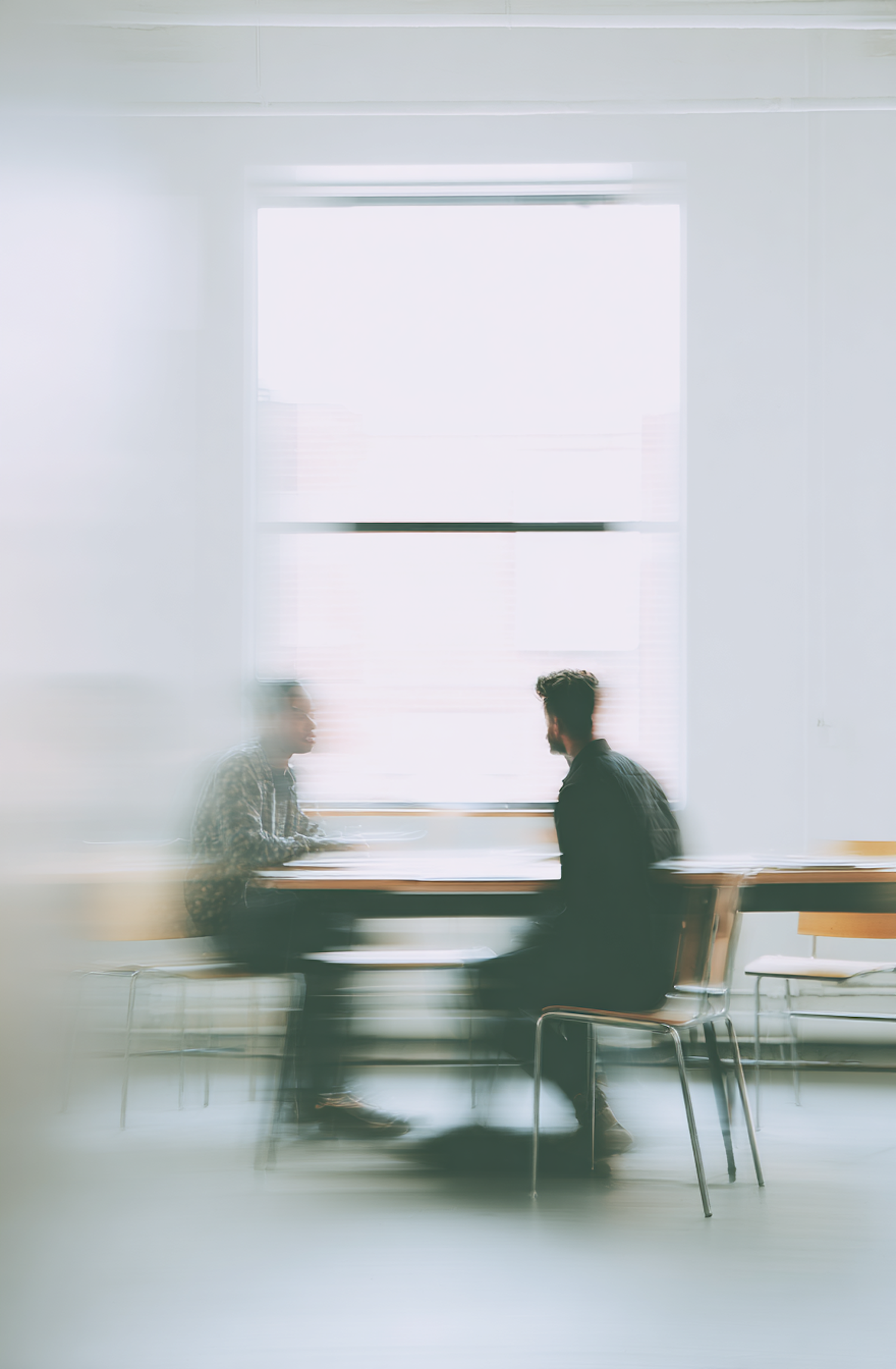 Artistic photo of two individuals in conversation at a table, featuring a motion blur effect and bright natural lighting.