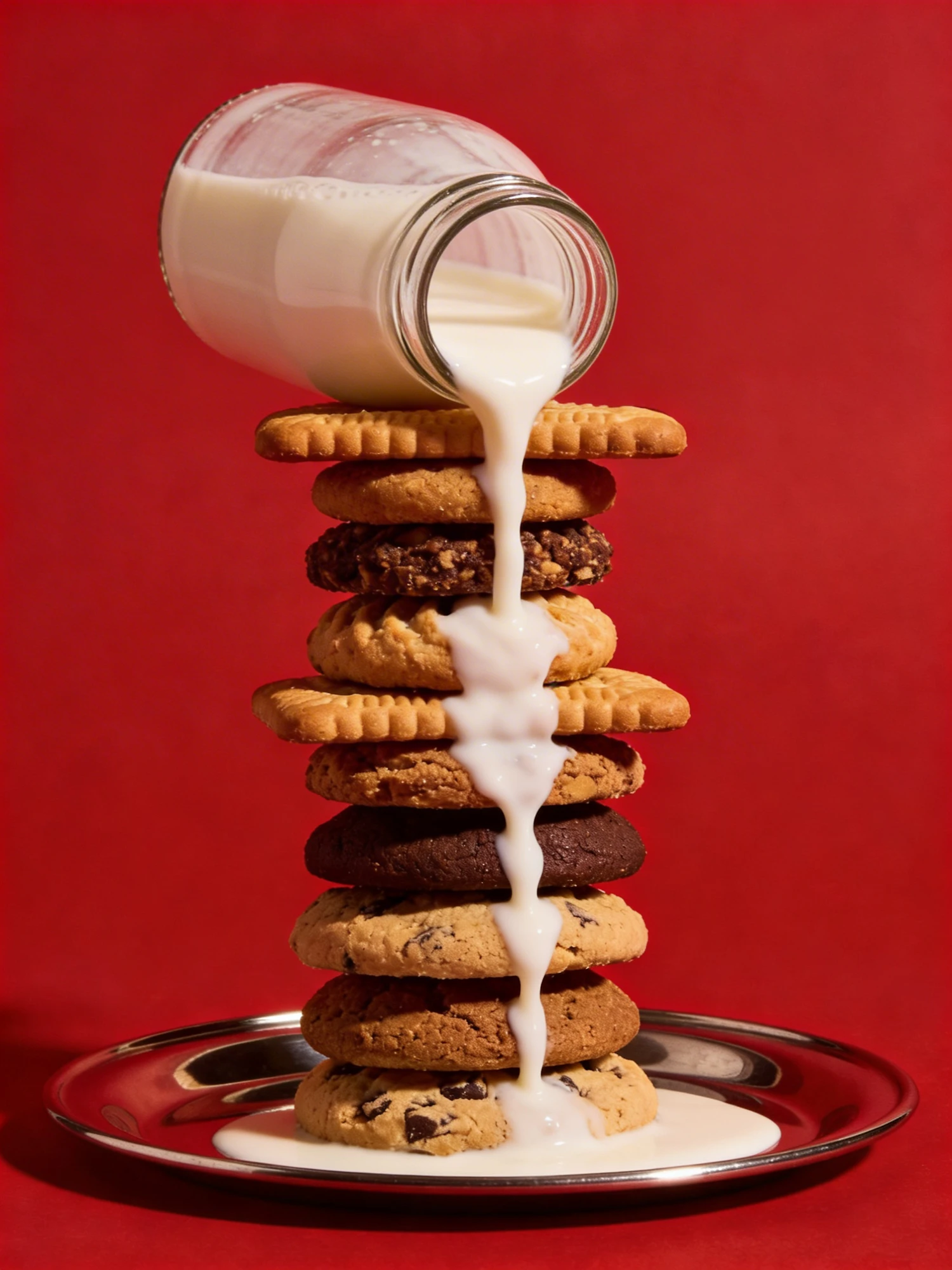 A stack of cookies with milk pouring over them, set against a bold red background, creating a visually striking and appetizing scene.