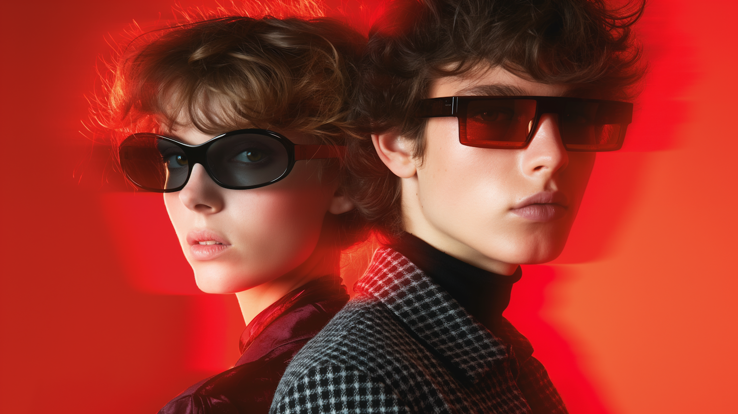 Stylish duo in bold sunglasses against a vibrant red backdrop, showcasing modern fashion and eyewear trends.