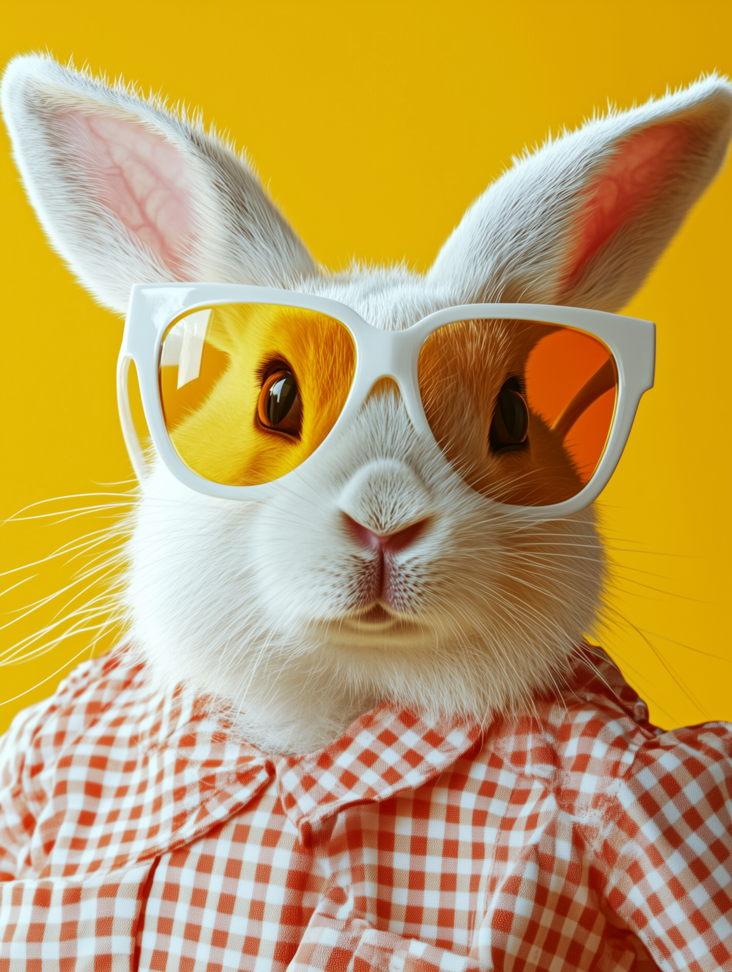 Stylish white rabbit in sunglasses and checkered shirt against a vibrant yellow background, exuding coolness and charm.
