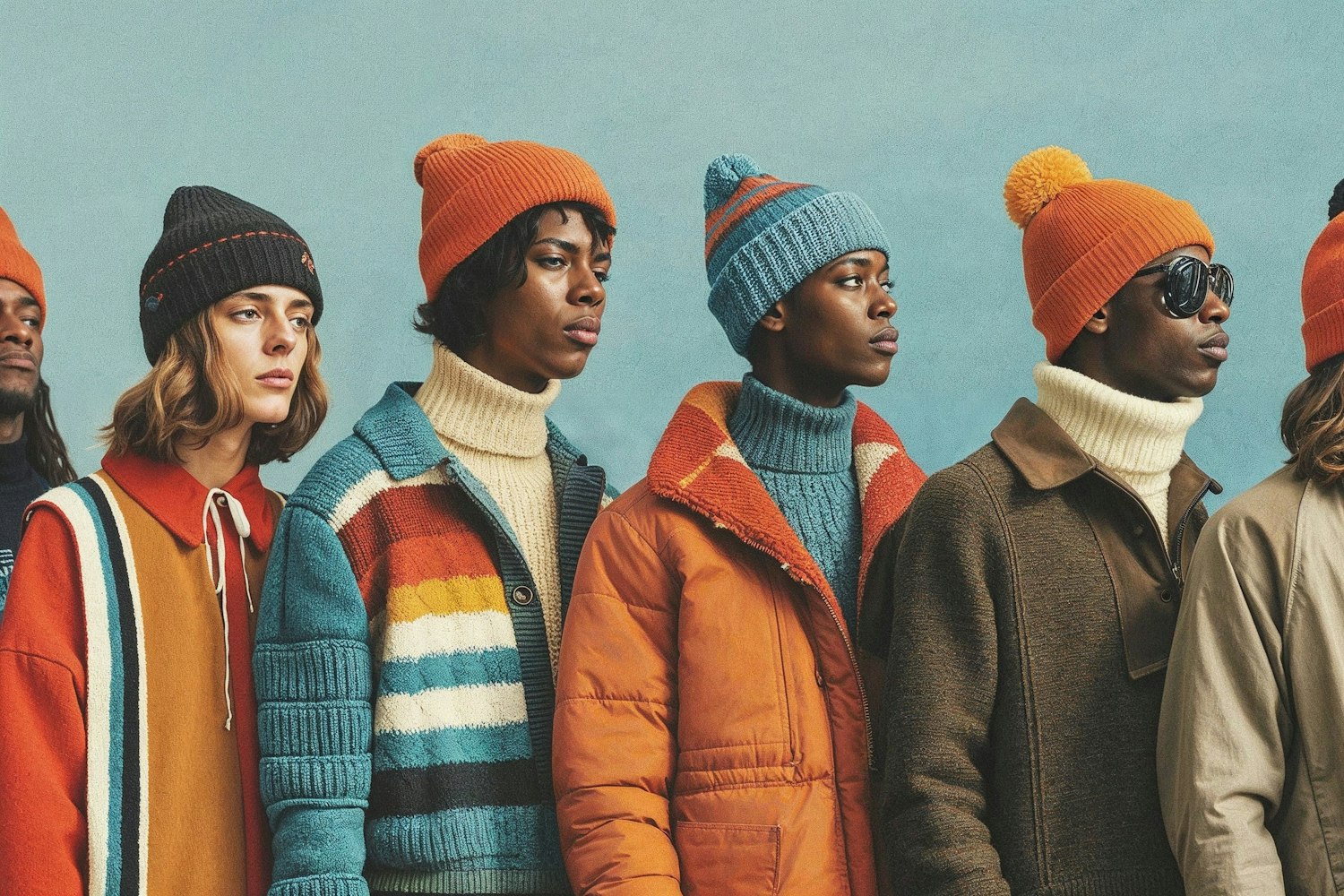 Stylish group in colorful winter attire, featuring beanies and jackets against a light blue background. Trendy and vibrant fashion.