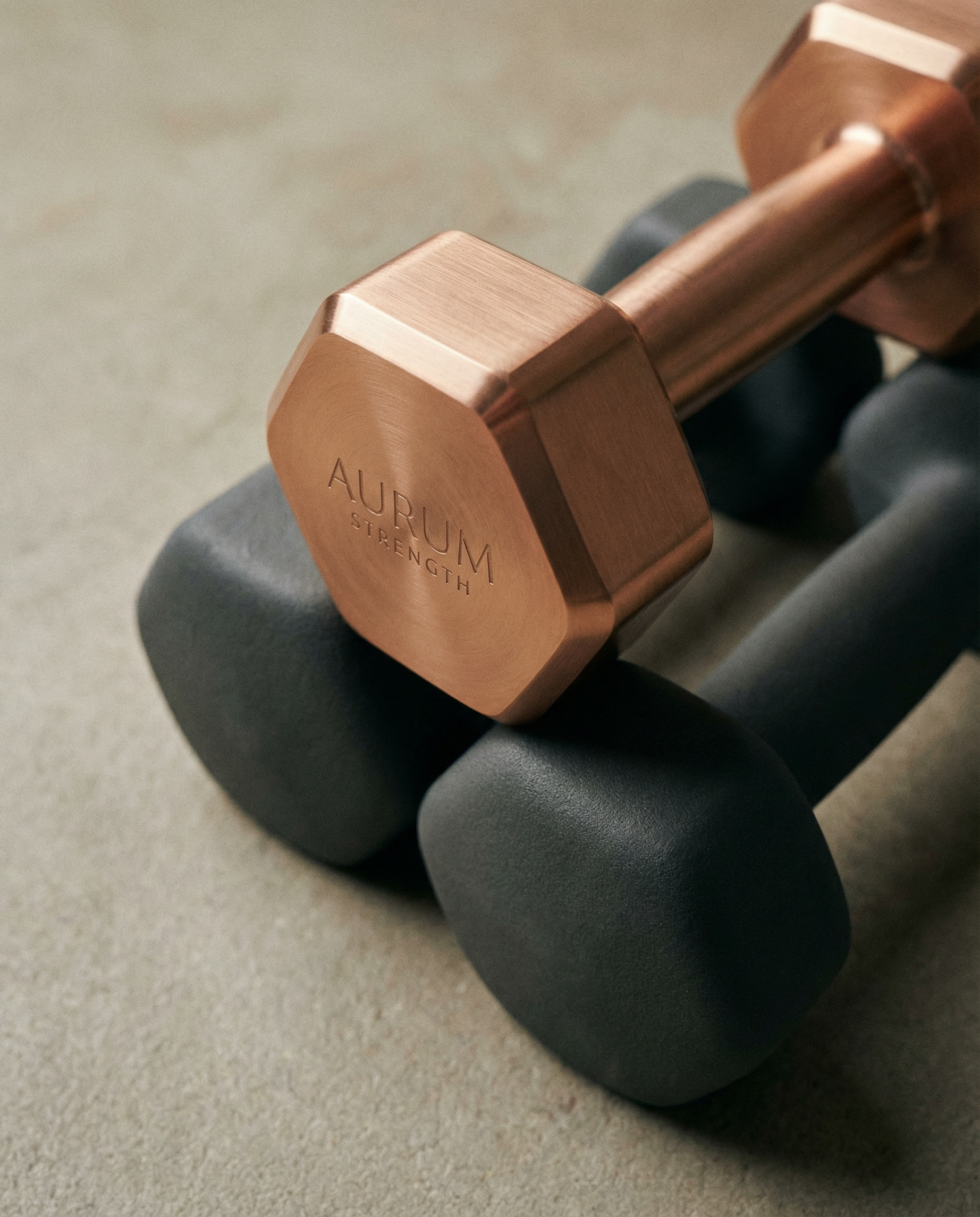 Close-up of a copper dumbbell engraved with 'Aurum Strength' resting on black dumbbells, showcasing premium fitness equipment.
