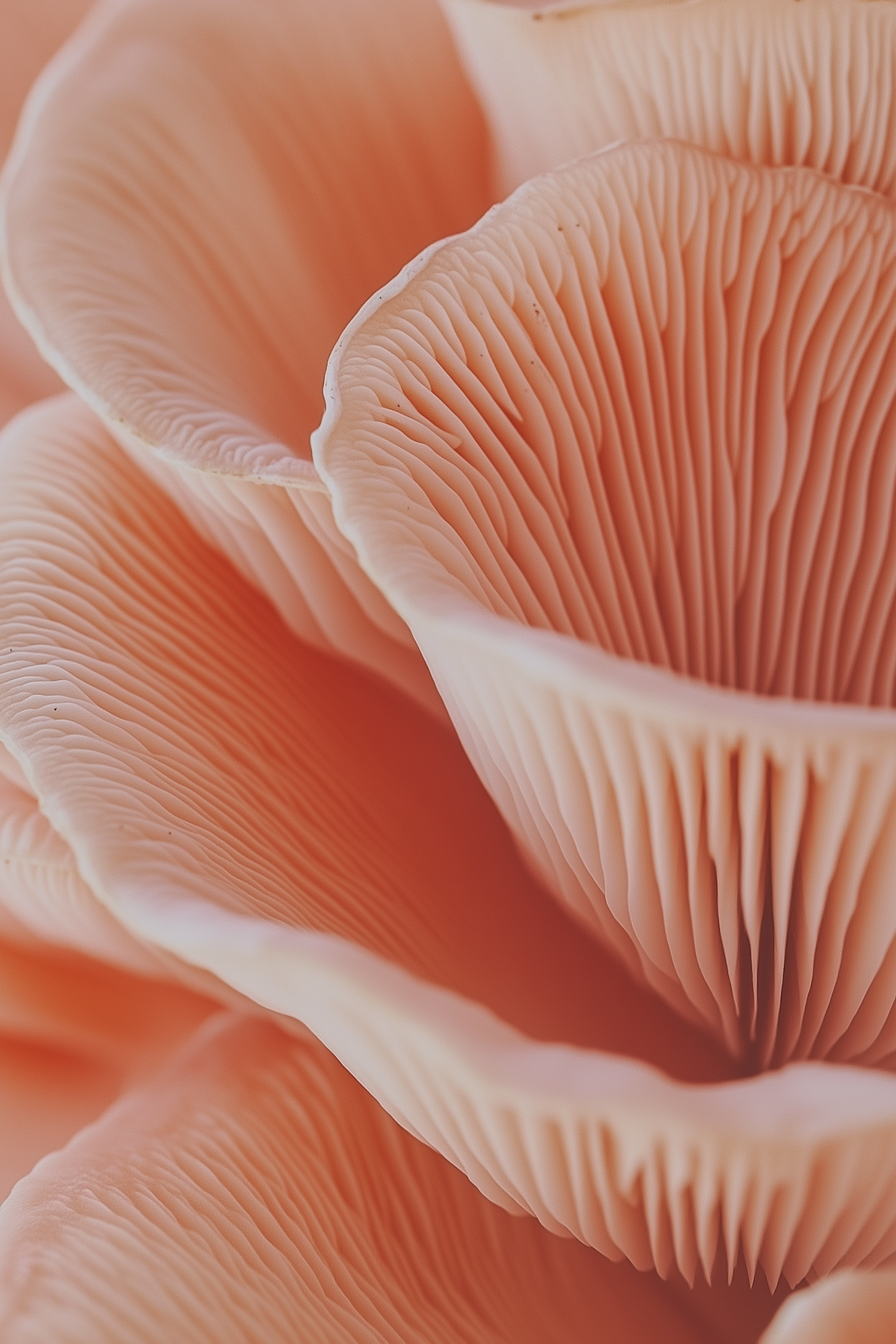 Close-up of coral-colored mushroom gills, showcasing intricate textures and warm hues in a mesmerizing natural pattern.