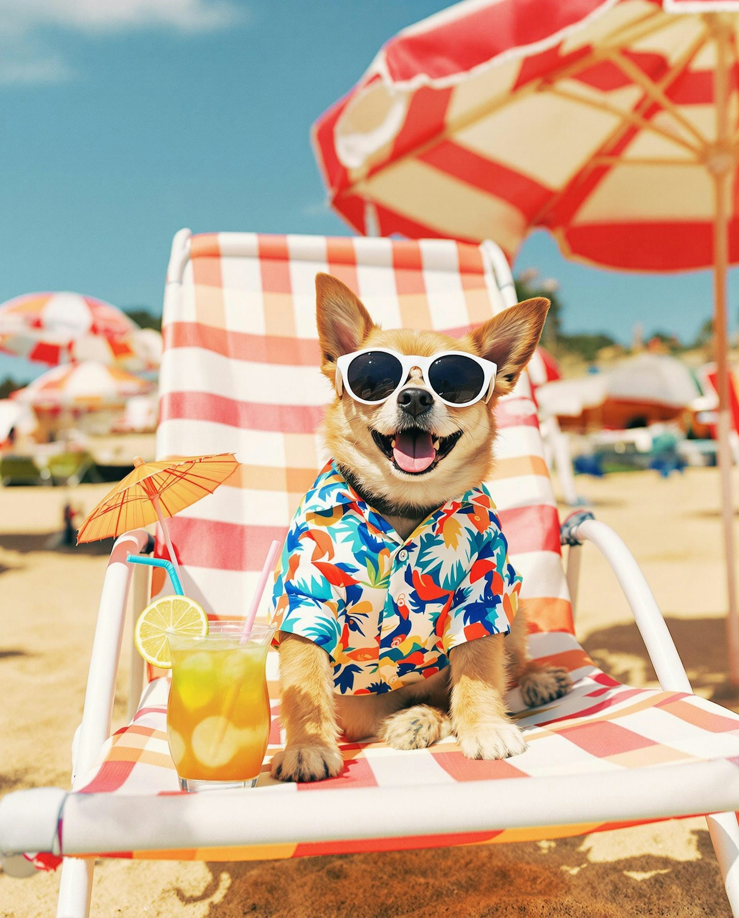 A happy corgi in a Hawaiian shirt and sunglasses relaxes on a beach chair with a tropical drink, surrounded by sunny beach vibes.