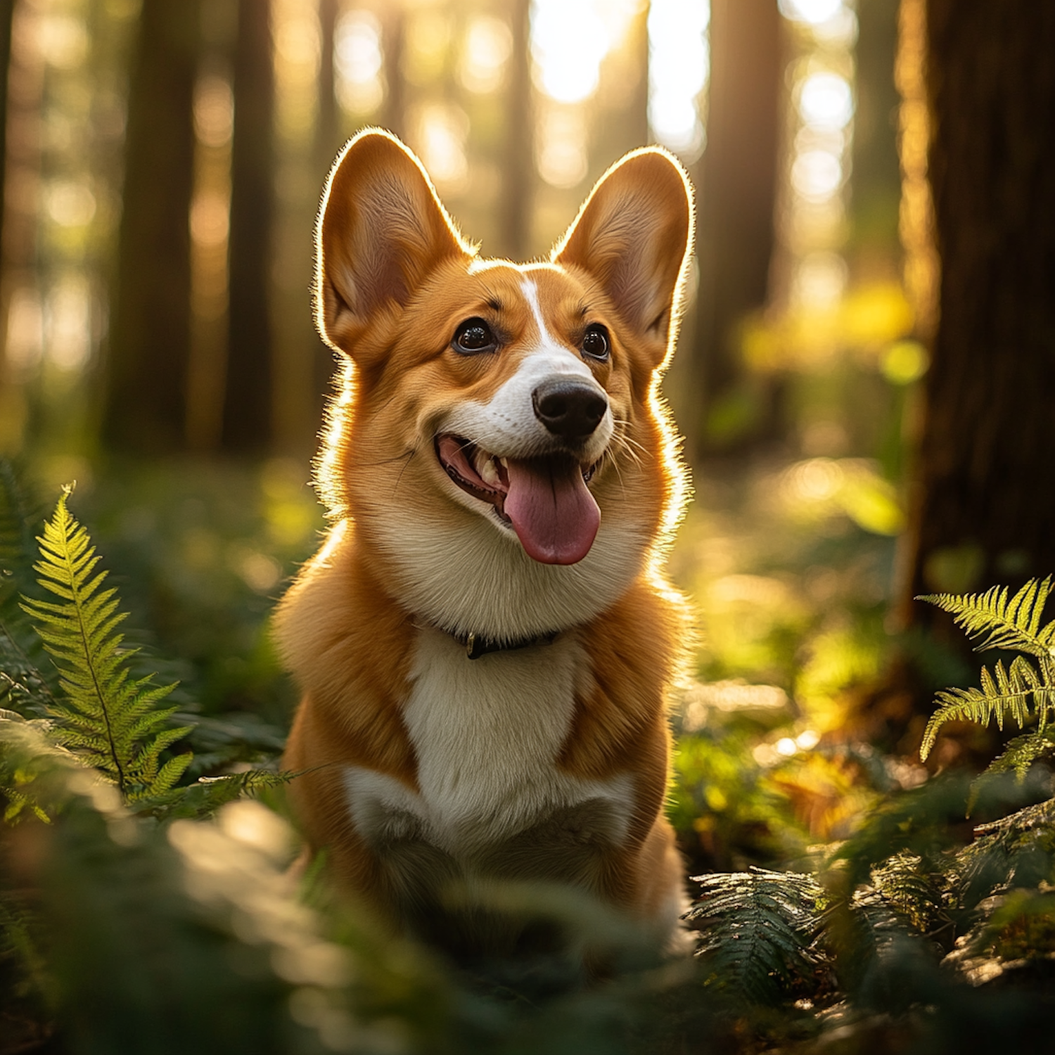 Adorable Corgi in a sunlit forest, surrounded by lush ferns and golden light, radiating joy and playfulness.