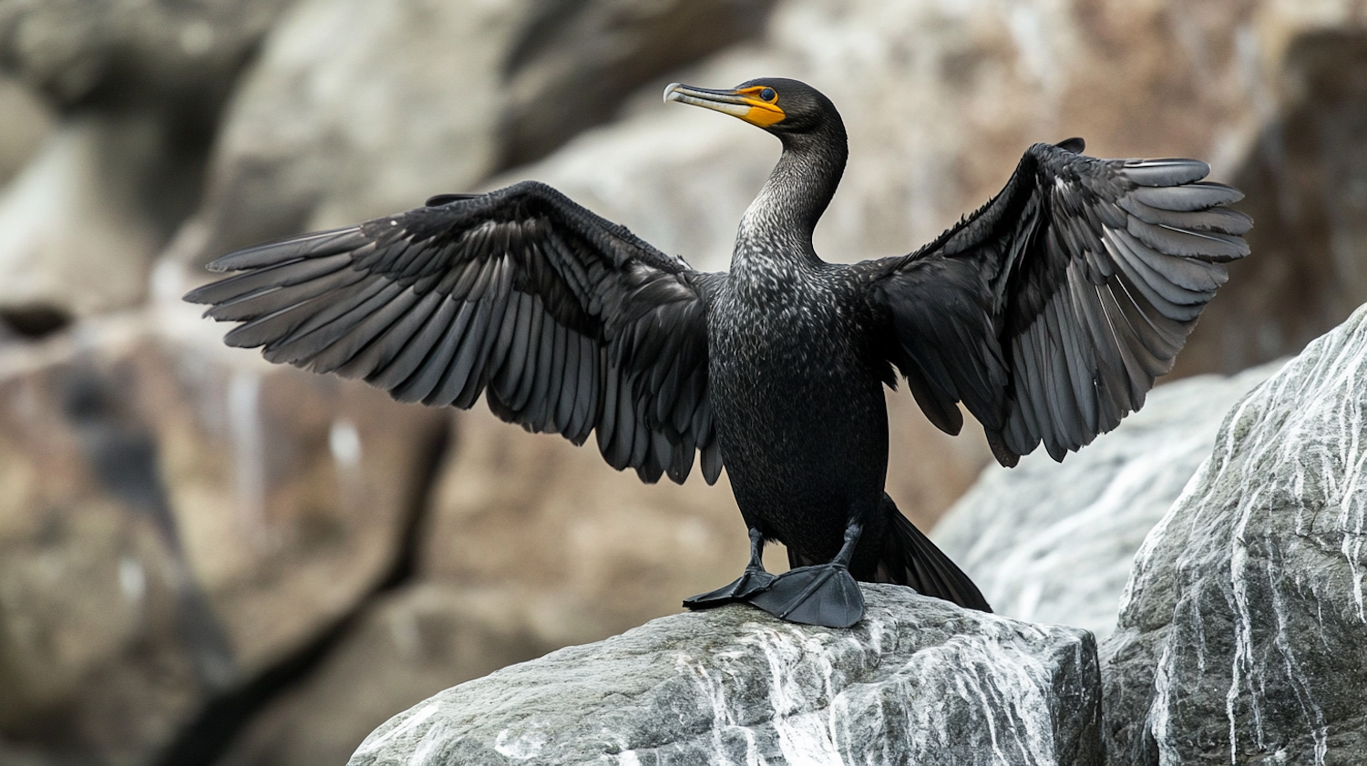 Majestic cormorant with wings spread wide on a rocky perch, showcasing glossy black feathers and a striking orange face patch.