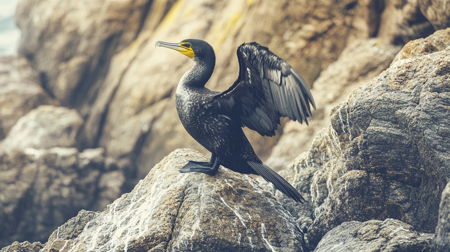 Cormorant with glossy black feathers and yellow beak patch perched on rugged rocks, wings spread in a serene coastal setting.