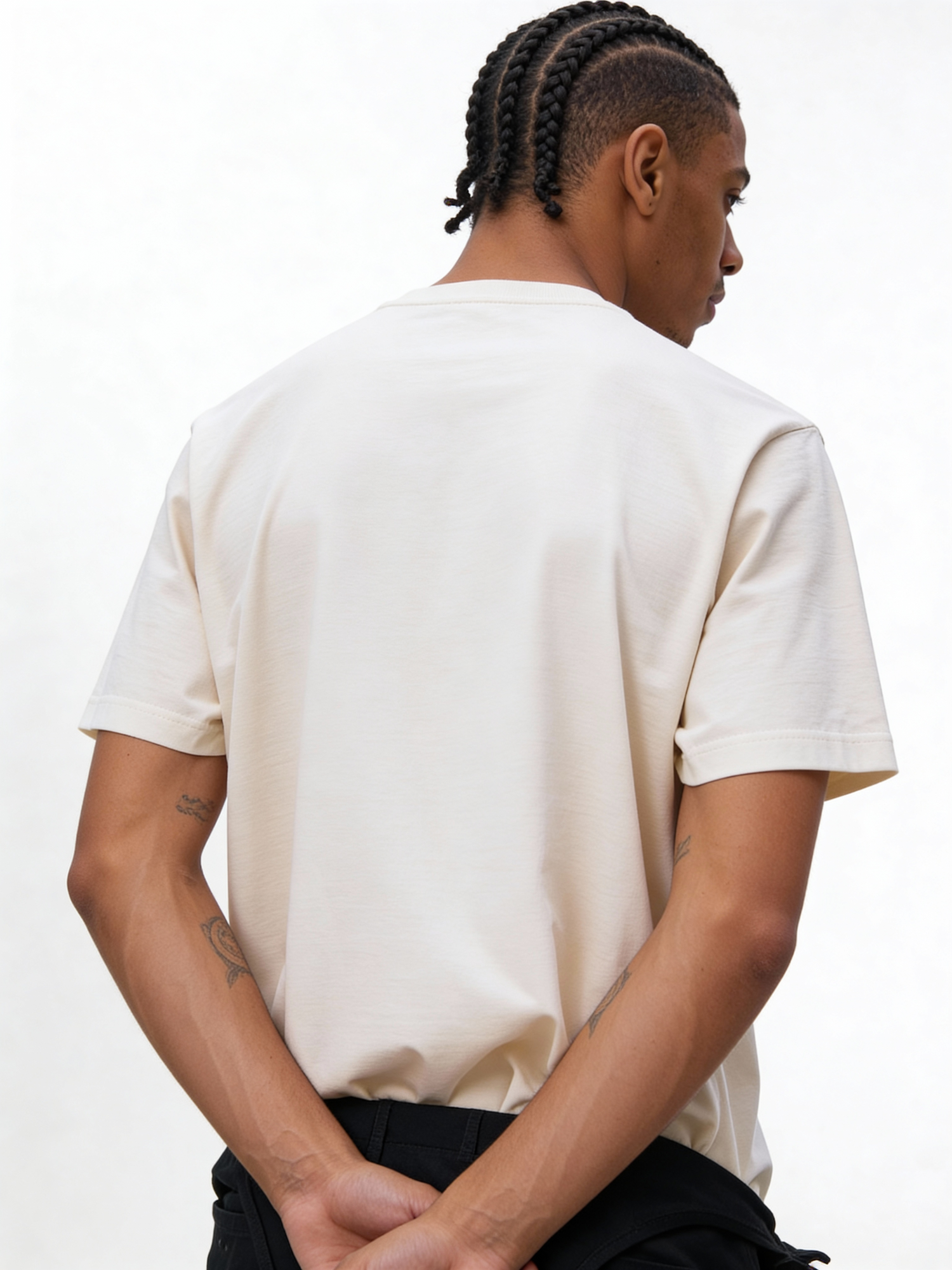 A person with braided hair in a light t-shirt and dark pants, seen from behind with arms crossed, against a plain background.