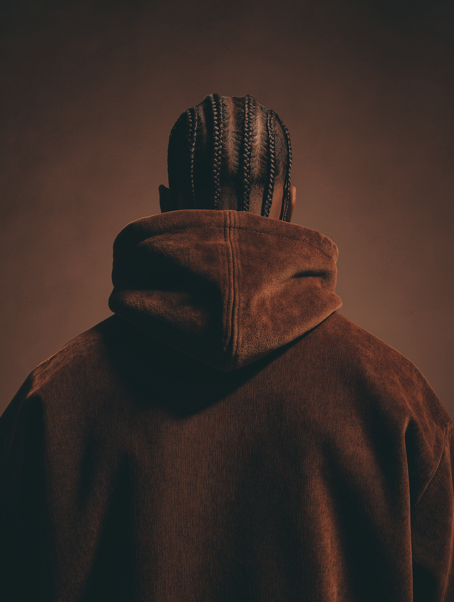 Back view of a person with cornrows wearing a brown hoodie, set against a warm, muted brown background.