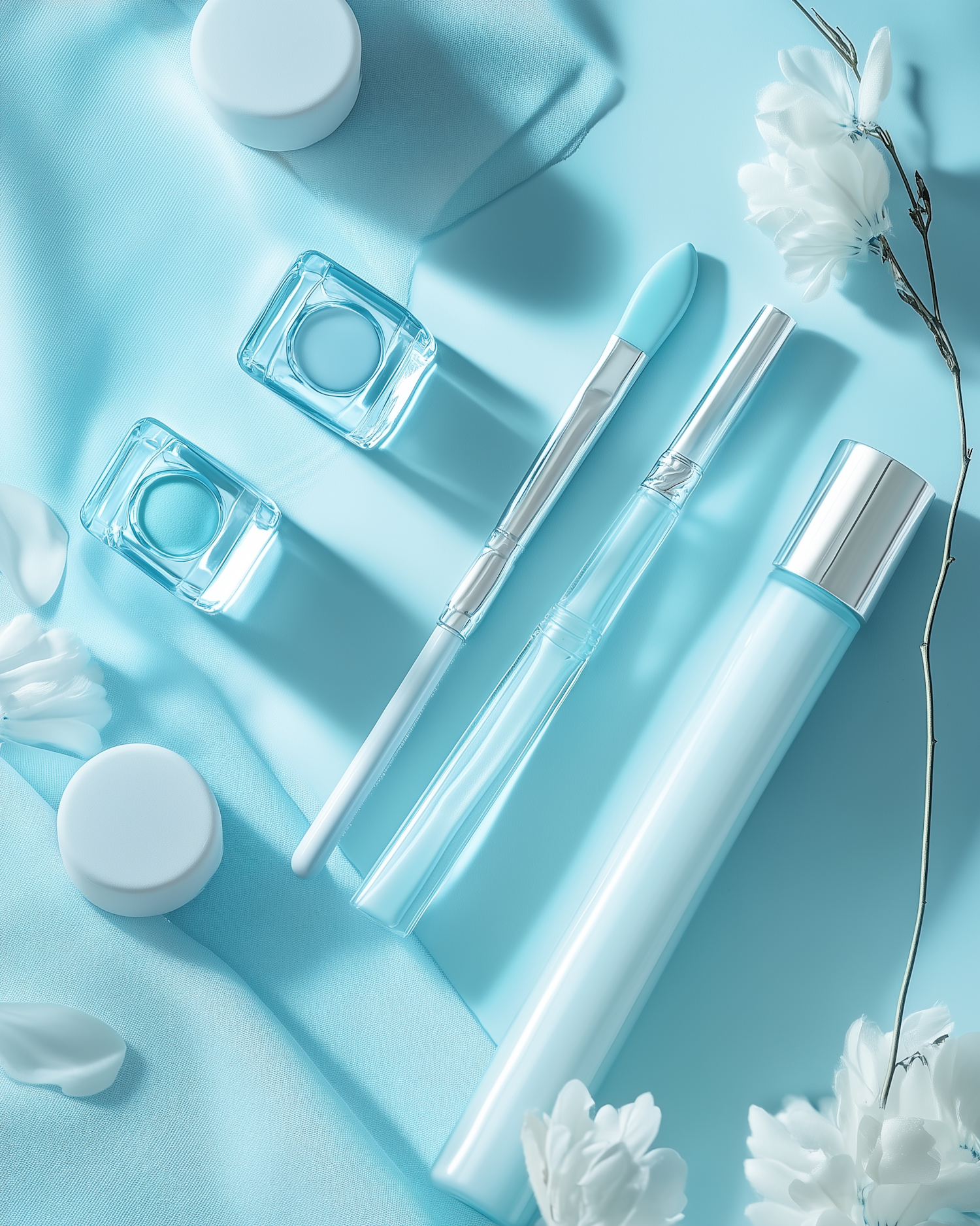 Elegant beauty products on a soft blue background with white flowers, featuring glass jars and sleek silver accents.
