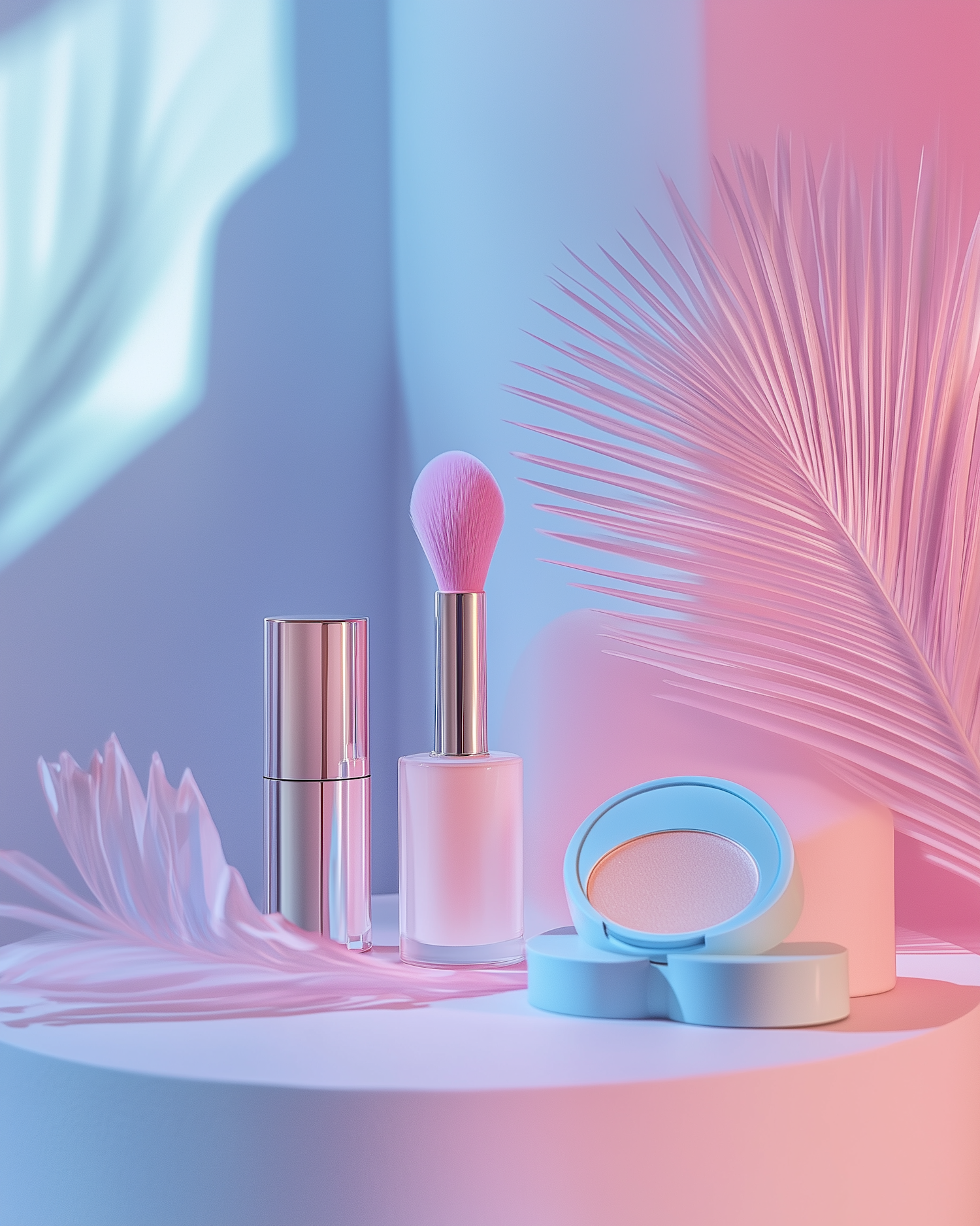 Elegant pastel-themed makeup display with lipstick, brush, and compact on a white platform, accented by pink and blue lighting.