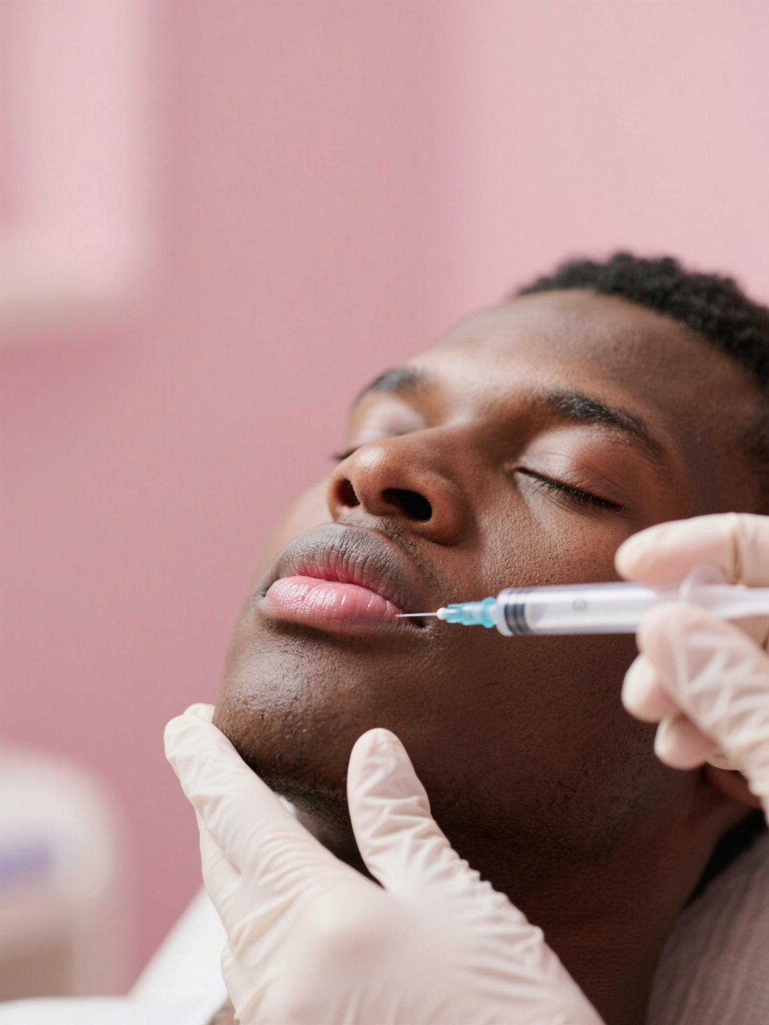 A black man with closed eyes and flawless skin receives a cosmetic lips injection with a syringe. He has a calm, composed expression. Aesthetic clinic pink background with medical gloves visible, soft lighting.