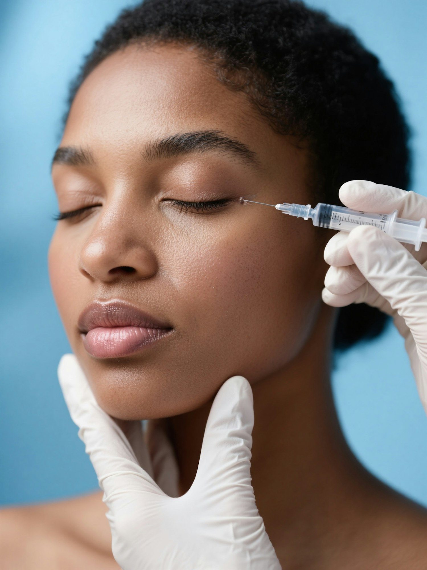 A calm, black woman with closed eyes receives a hyaluronic acid facial injection in the temple area. A healthcare professional wearing white gloves holds his chin and administers the injection with a syringe. Clinical, aesthetic blue background, professional lighting, high-resolution medical aesthetic photo.