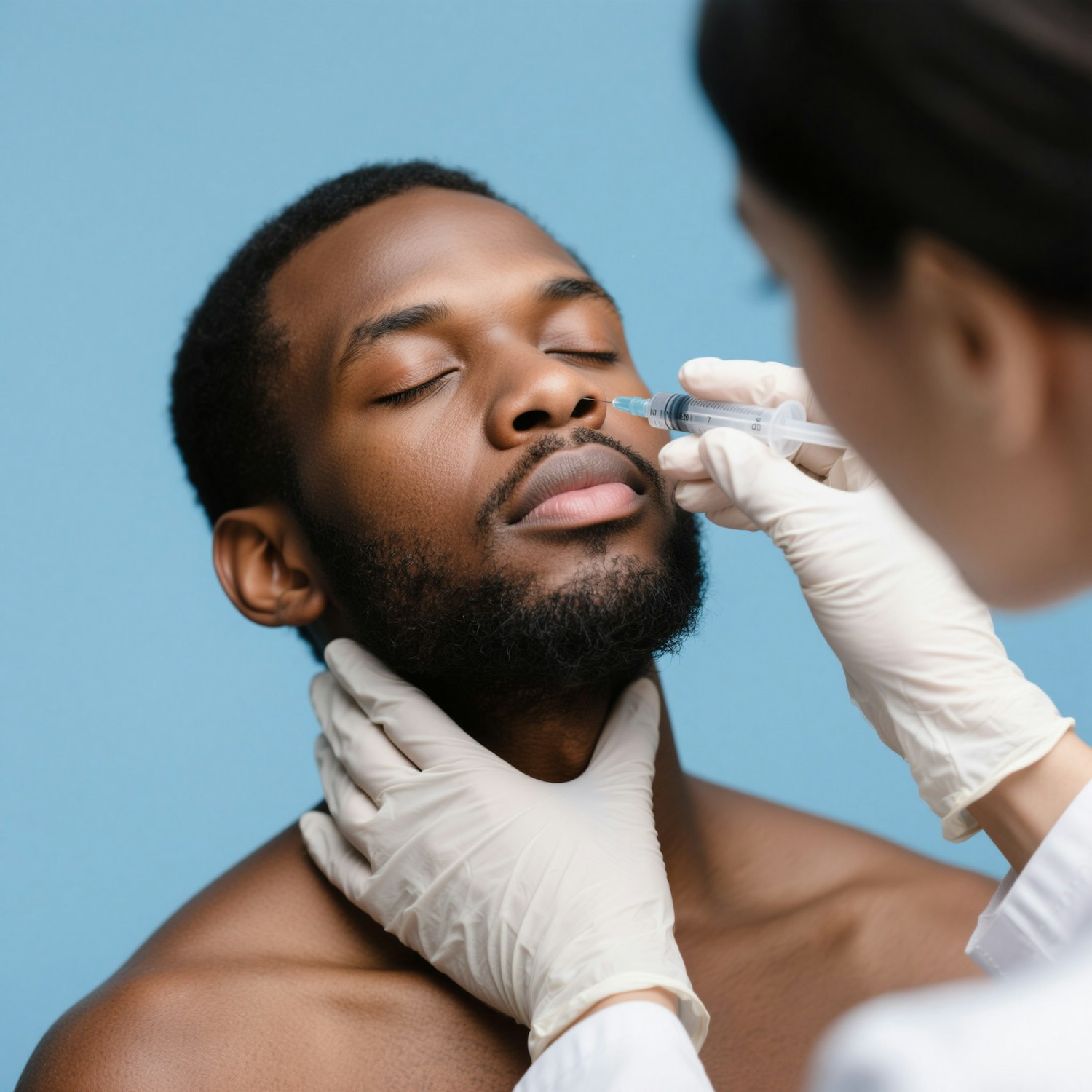 A calm, black bearded man with closed eyes receives a hyaluronic acid facial injection in the temple area. A healthcare professional wearing white gloves holds his chin and administers the injection with a syringe. Clinical, aesthetic blue background, professional lighting, high-resolution medical aesthetic photo.