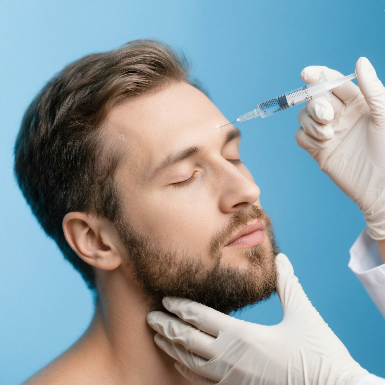 Man receiving a cosmetic injection on his forehead, performed by a professional in gloves, against a clean blue background.