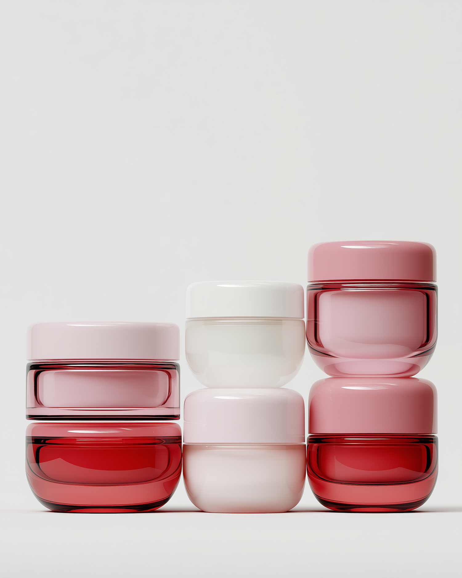 A set of six stylish cosmetic jars in shades of white, pink, and red, arranged neatly against a neutral background.