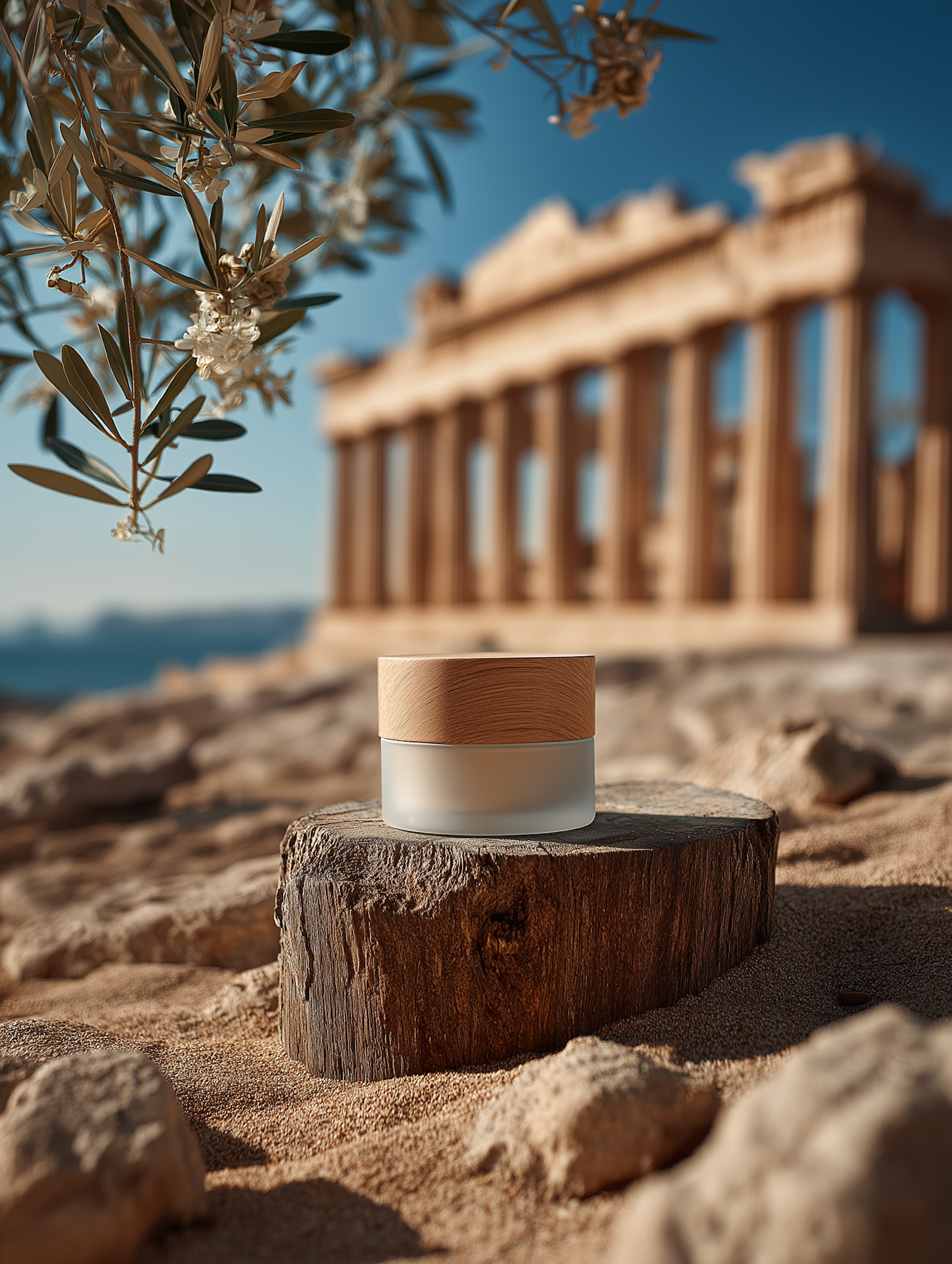 A cosmetic jar with a wooden lid on a stump, set against the Parthenon and olive branches, blending natural and historical elements.