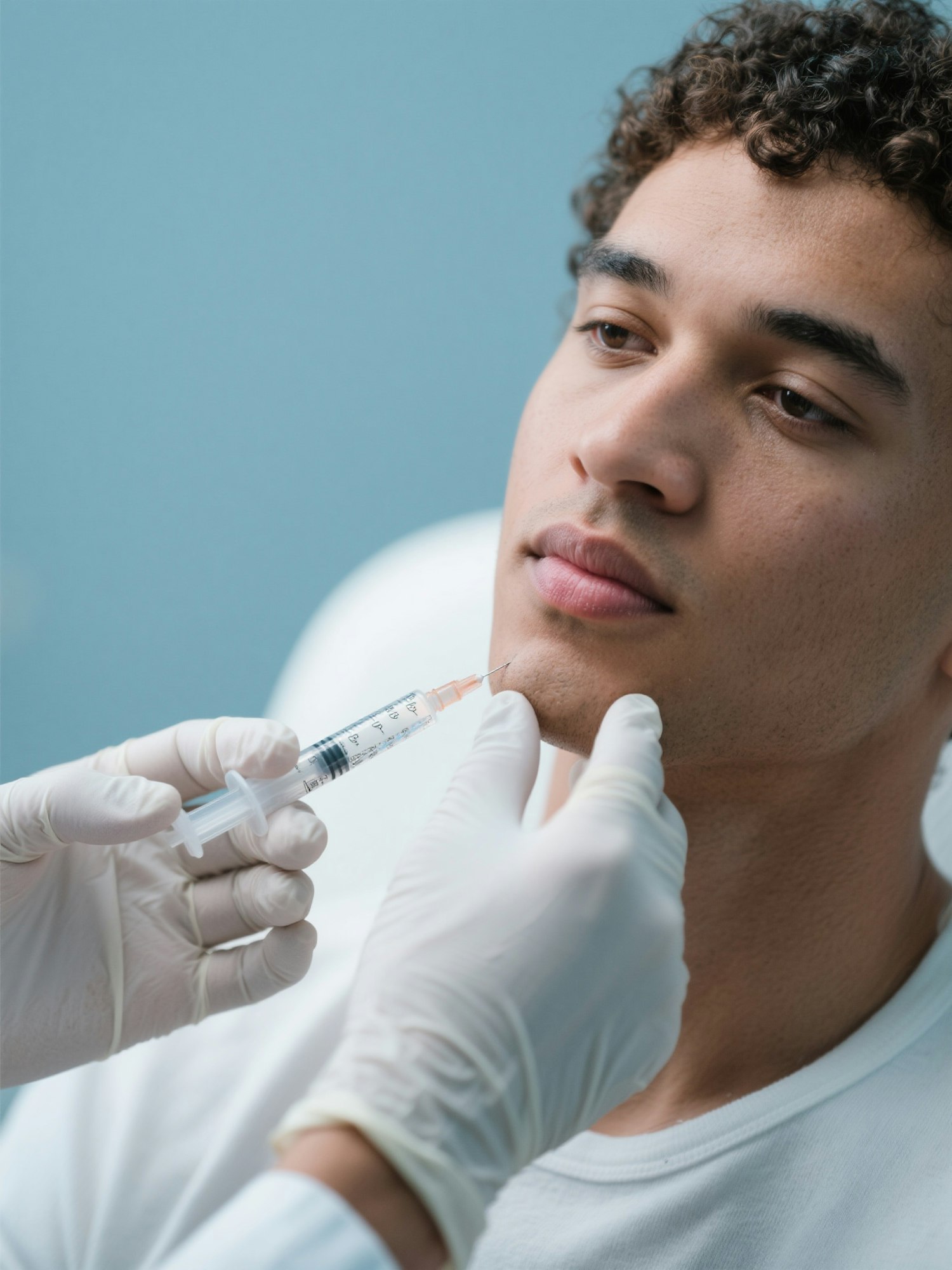 An american man curly hair with defined features sits calmly as a medical professional prepares to inject along his jawline. White gloves and sterile environment in plain light blue background