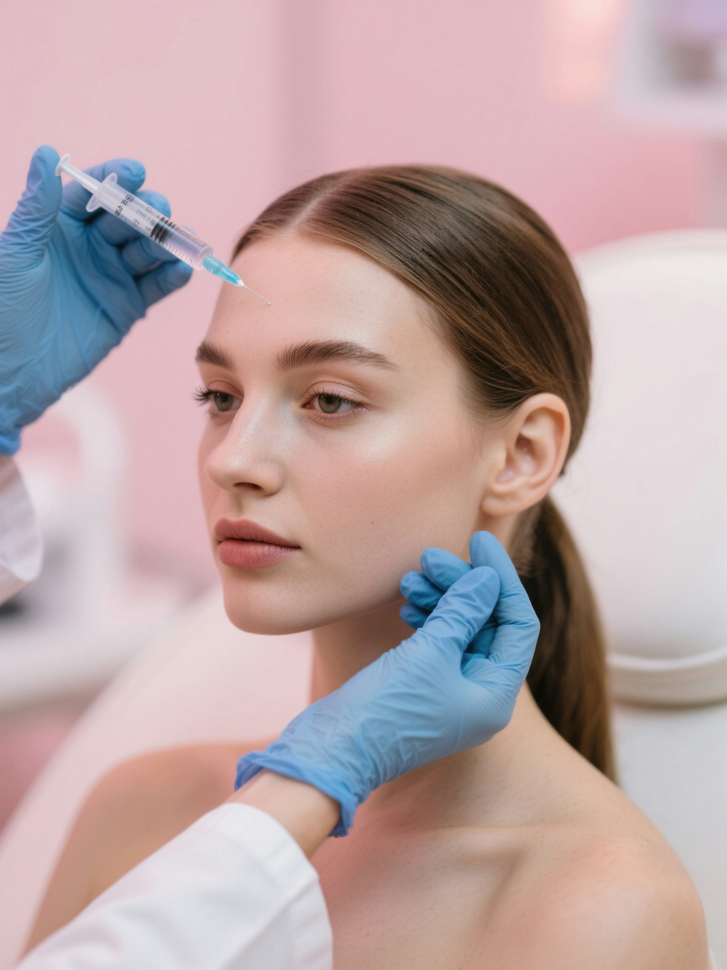 A young woman with flawless skin and hair pulled back receives a cosmetic forehead injection with a syringe. She has a calm, composed expression. Aesthetic clinic pink background with medical gloves visible, soft lighting.