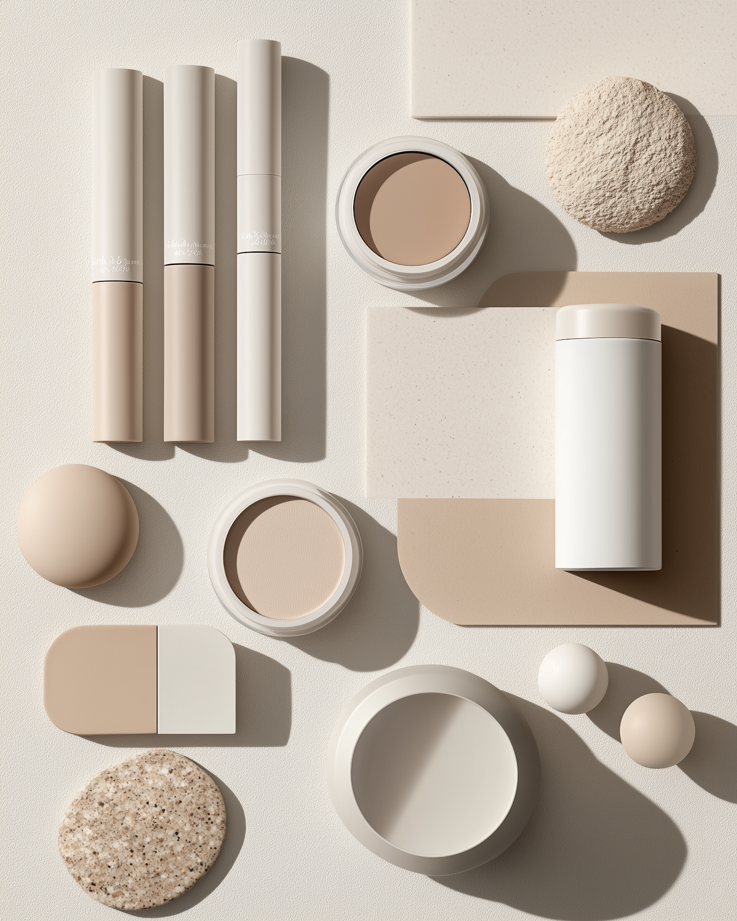 Minimalist beige and cream cosmetics arranged on a light surface, showcasing modern design and neutral tones.