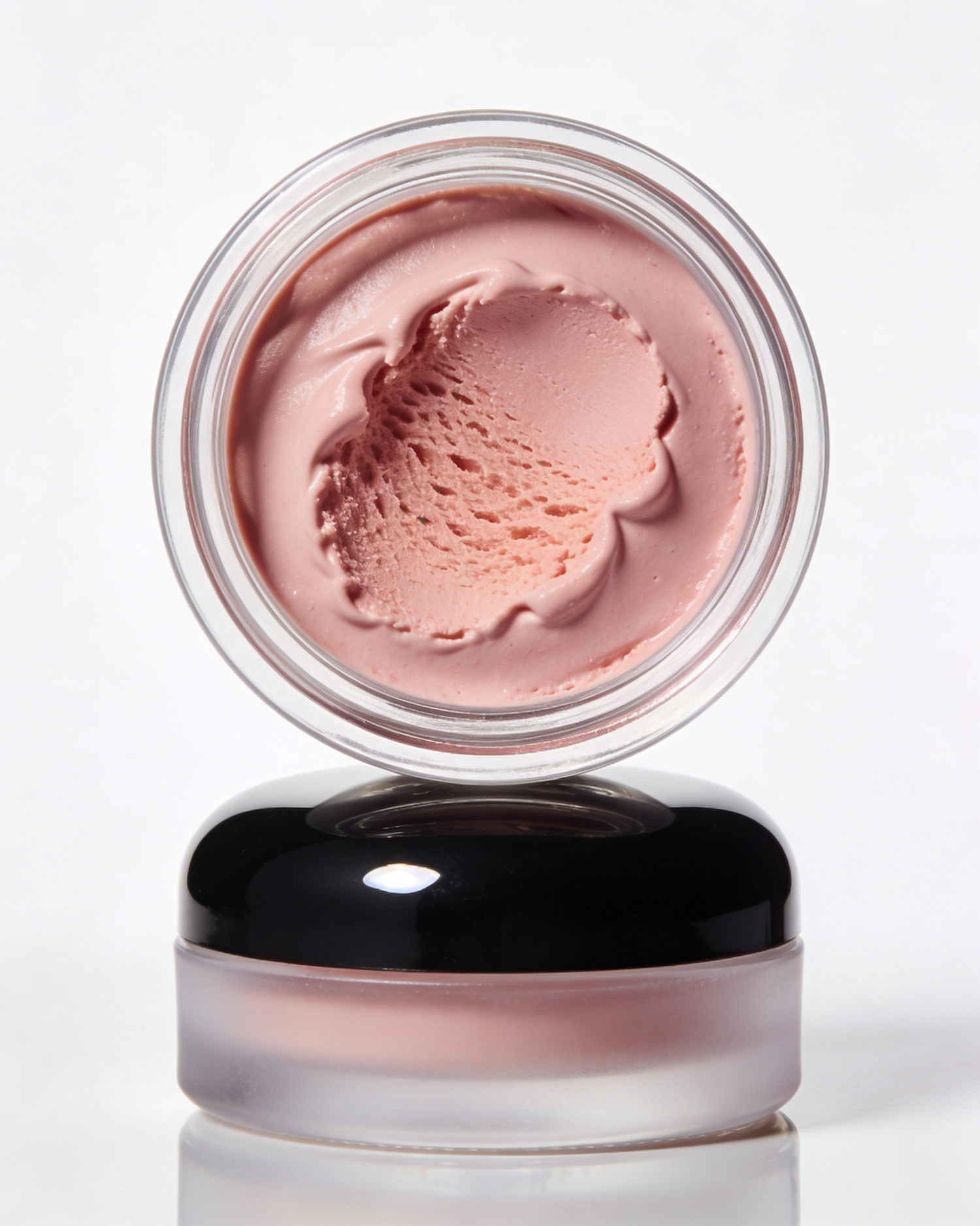 A close-up of a pink cream in a frosted container with a black lid, showcasing its smooth texture and elegant design.