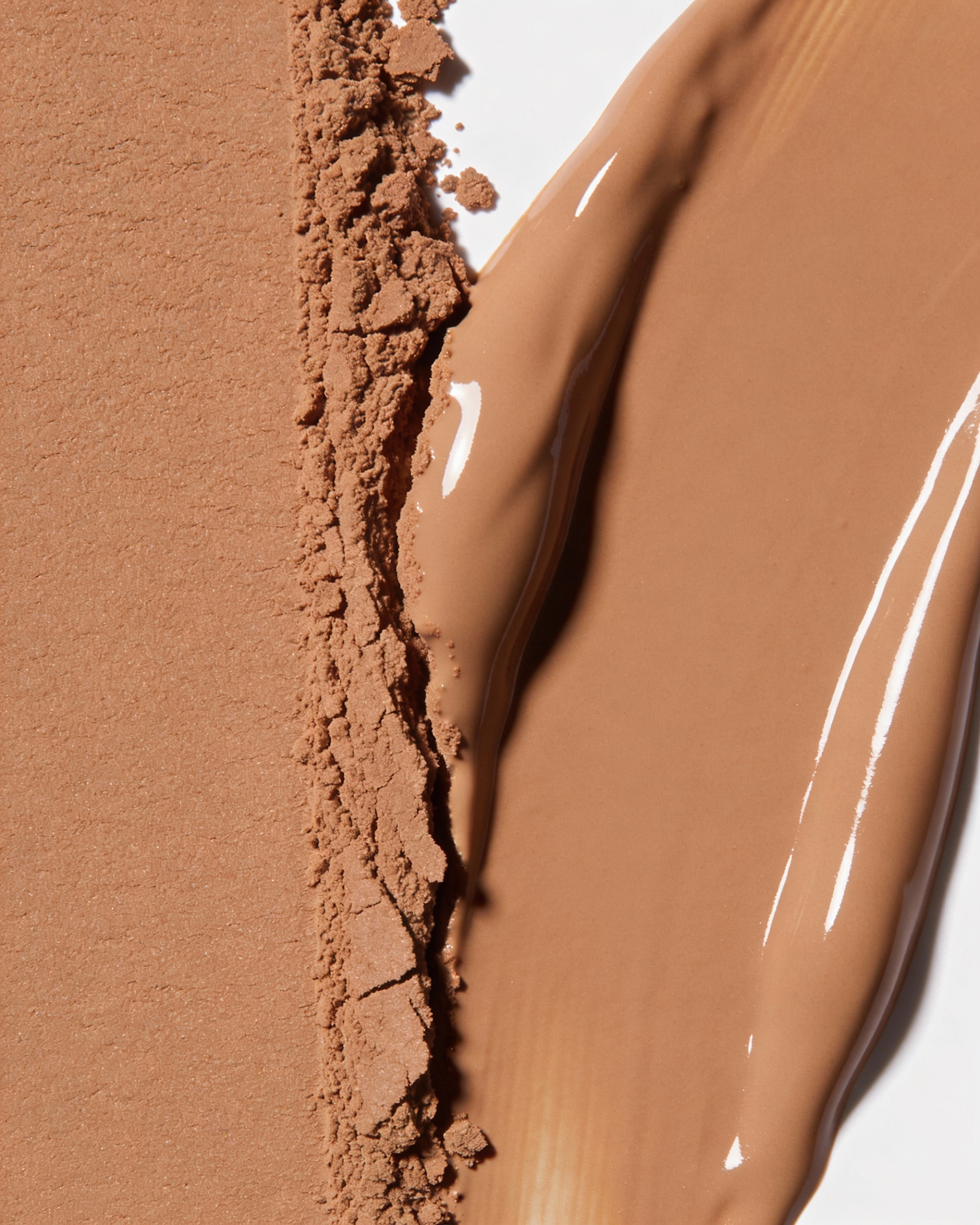 Close-up of liquid foundation and powder textures in warm tones, highlighting their contrasting finishes and smooth application.