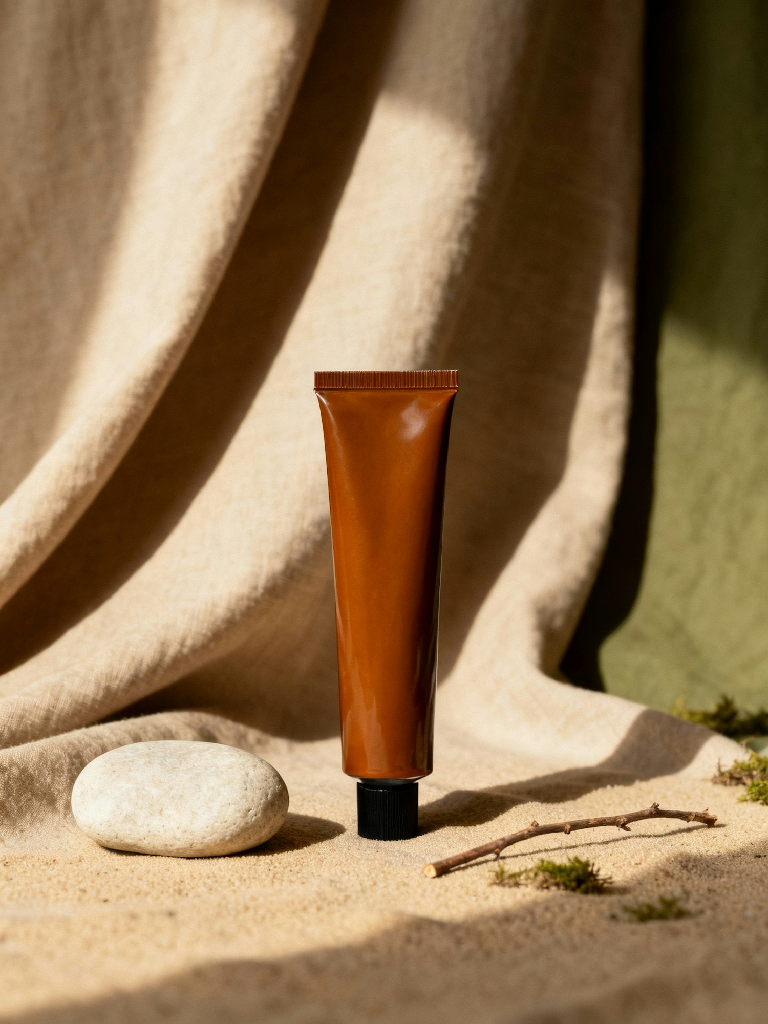 A brown cosmetic tube on sand with a stone and twig, set against a beige fabric backdrop with natural sunlight and shadows.