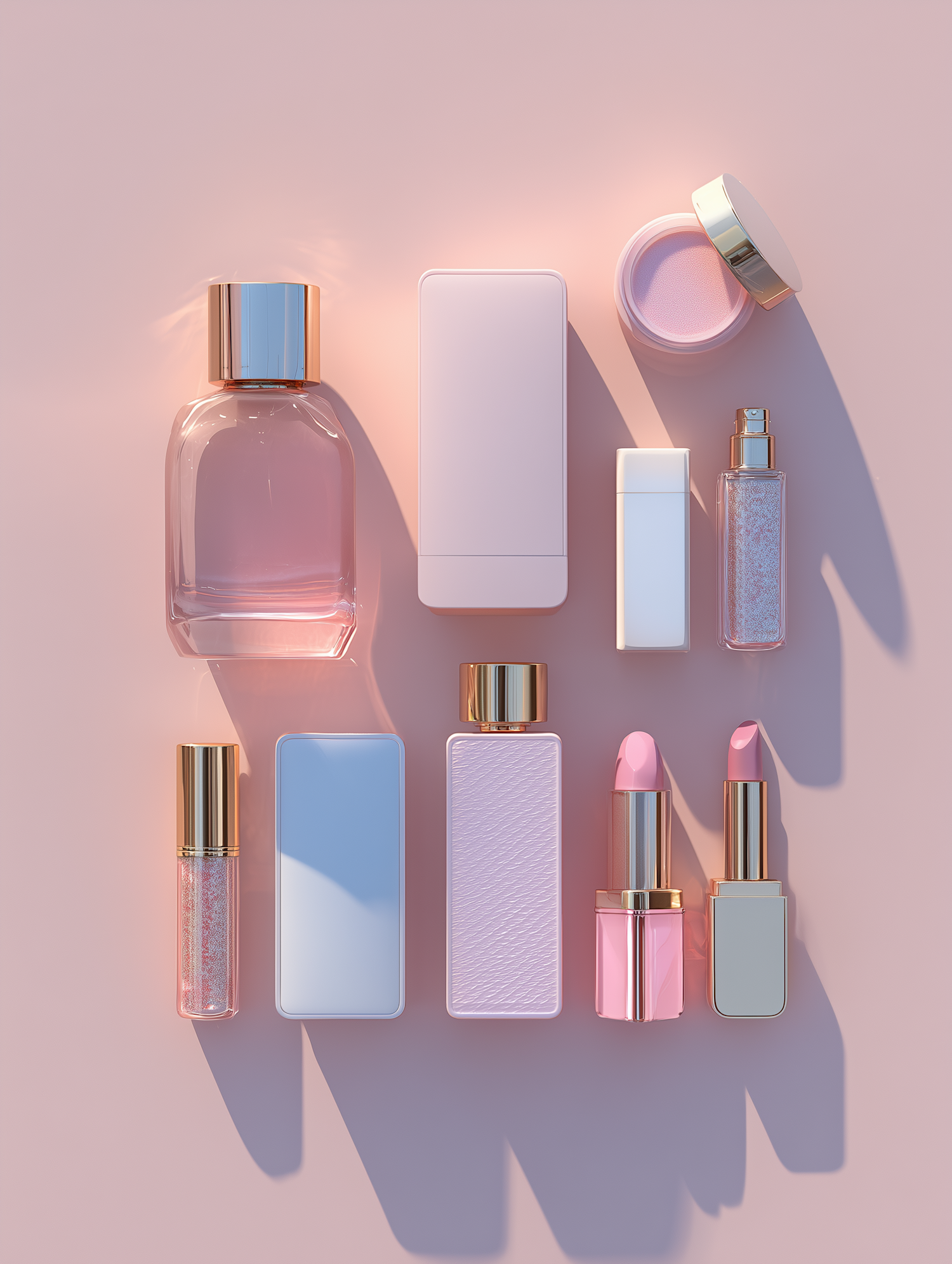 Elegant flat lay of pastel and gold-accented cosmetic products on a pink background, perfect for beauty and skincare inspiration.