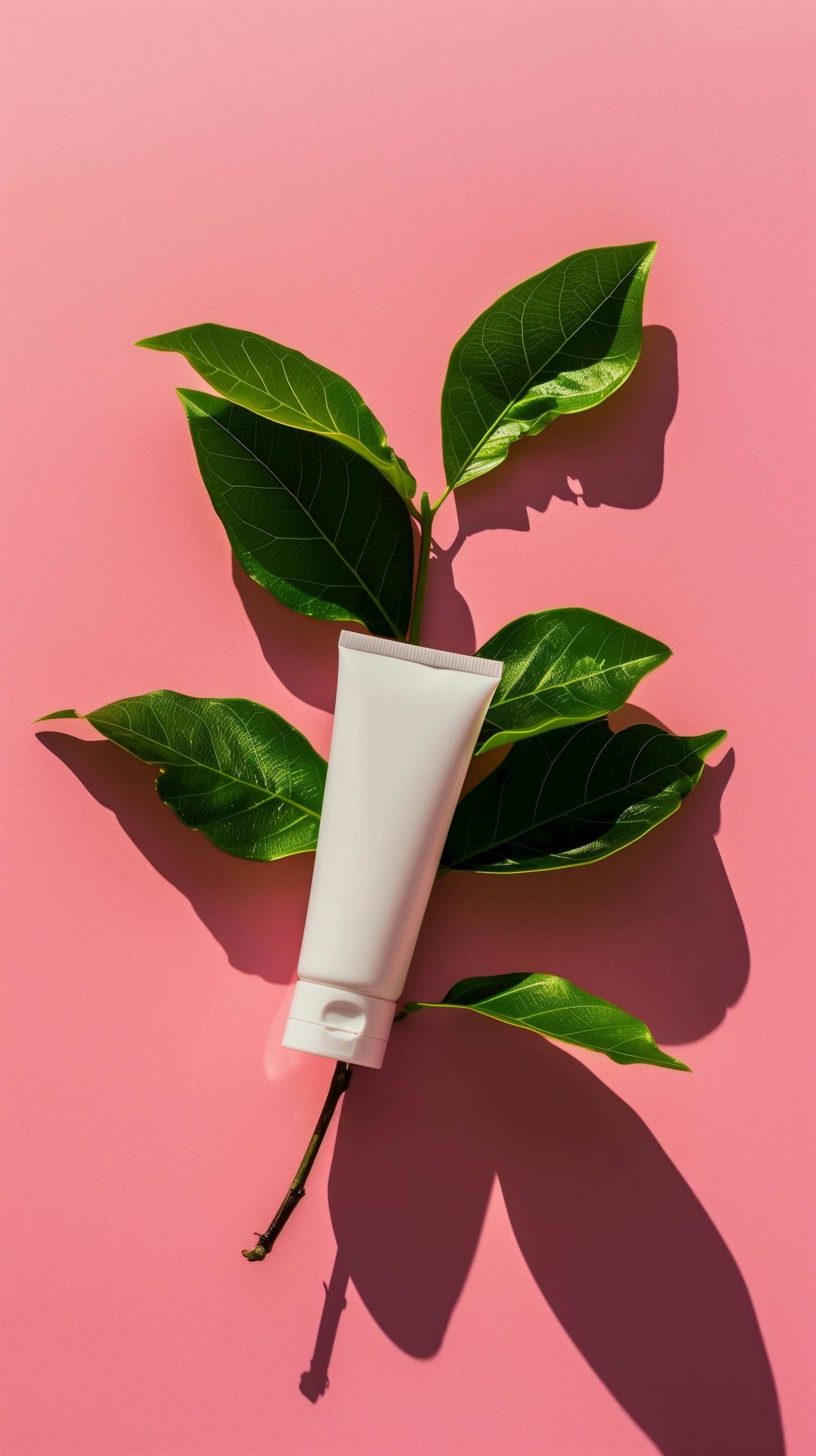 White cosmetic tube on pink background with green leaves, symbolizing natural beauty and eco-friendliness.
